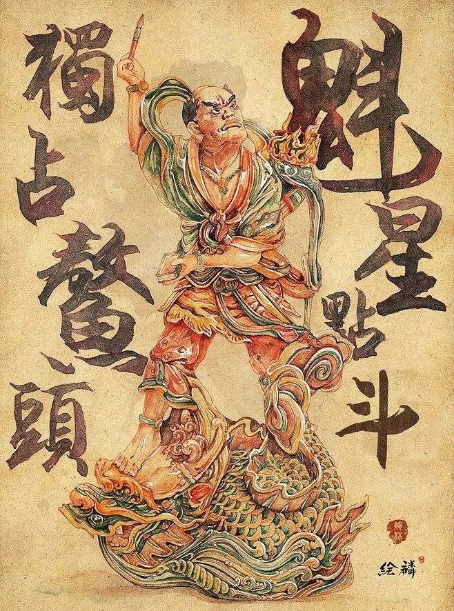 奎星,是二十八宿之一的西方白虎宫的七宿之首的奎星,是主宰天下文运的大吉星。奎星称为魁星的三大来源出处:其一,因其形貌黑脸红发以鬼面出现,右手执朱批笔、左手托金印,左脚后翘踢斗而得名为魁星。其二,奎与魁同音,又是七宿之首,魁在中文大意里代表首位,有意头十足、独占鳌头之喻。魁星赐斗是古代科举人士最为喜欢的意头,具有吉祥如意、功成名就的非常象征。其三,奎星是专门主管文运之神,从星相图看,奎星屈曲相钩,似文字之画,隧将奎星称为魁星。