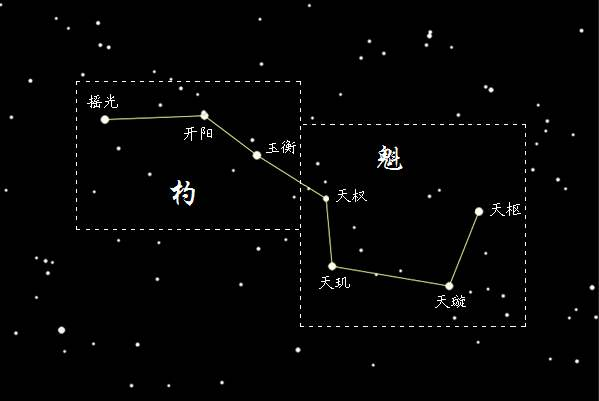 北斗星的名气之大,被受民间敬仰与崇拜,因果有二。一是决定季节,在不同季节的夜晚时间,北斗星的斗柄出现在天空中指向不同的方向。因此,古人根据初昏时斗柄所指的方向来决定季节:斗柄指东,天下皆春,即春季。斗柄指南,天下皆夏,即夏季。斗柄指西,天下皆秋,即秋季。斗柄指北,天下皆冬,即冬季。其二是北斗星是吉祥星,内含魁星,魁星内有文曲星,文曲星是主宰天下文运的大吉星。
