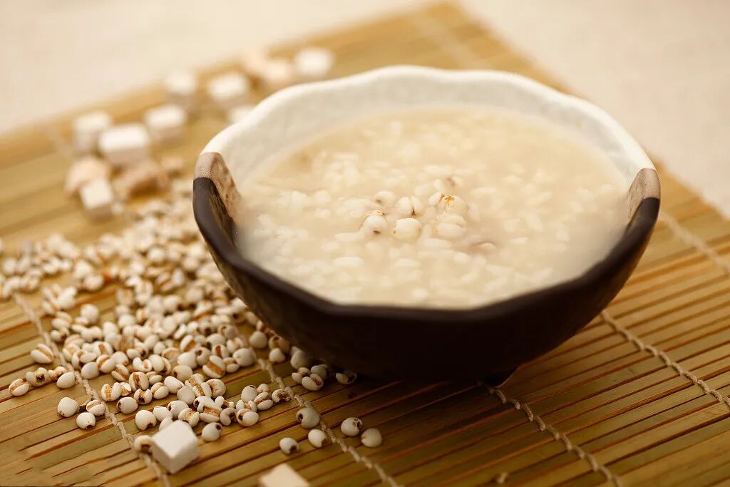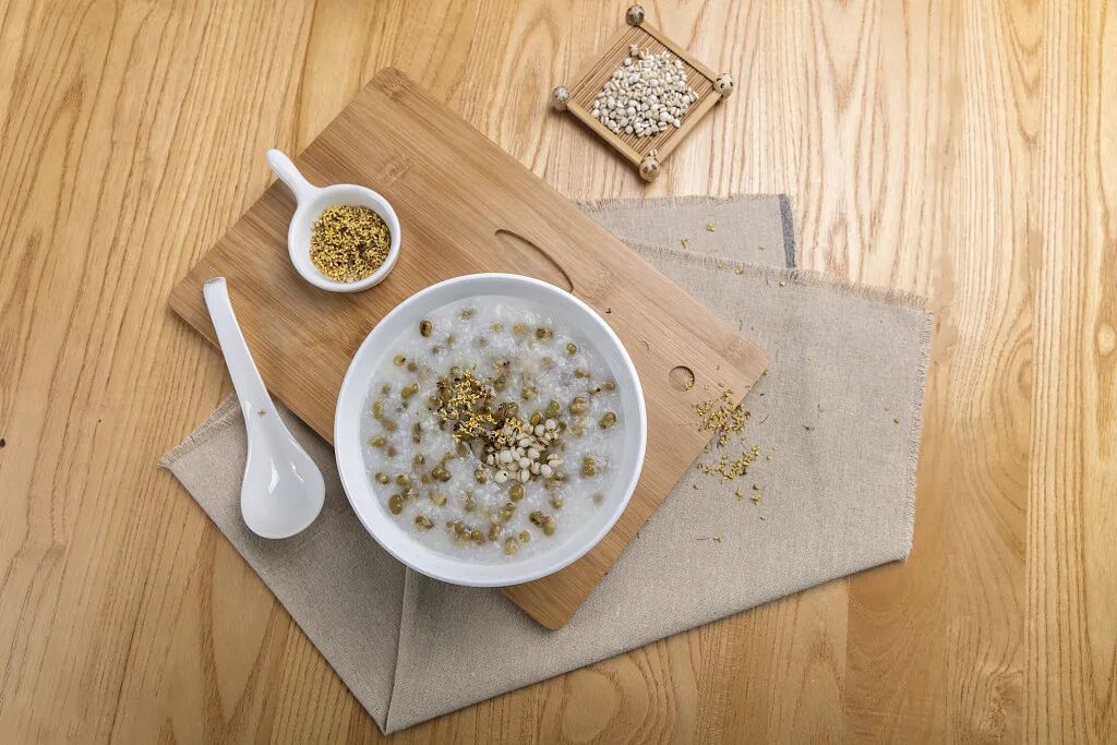 薏仁健脾化湿,绿豆清热解毒。薏仁在煮之前需以温水浸泡2-3小时,让它充分吸收水分,绿豆最好也浸泡12小时,然后等份煮粥即可。