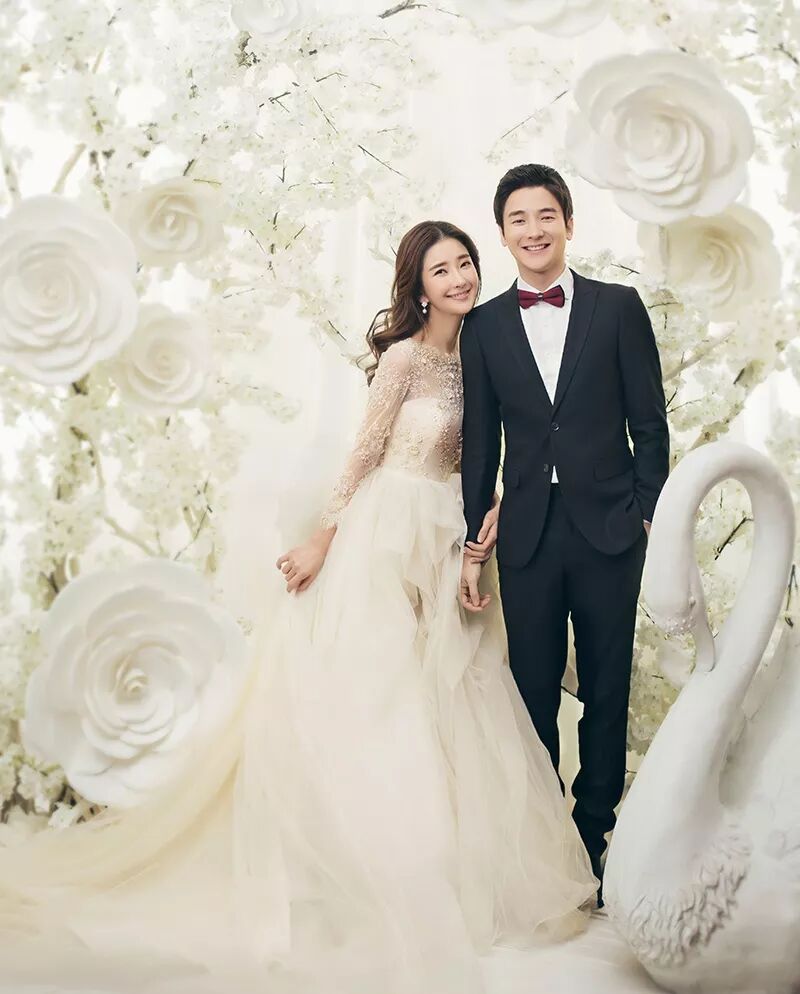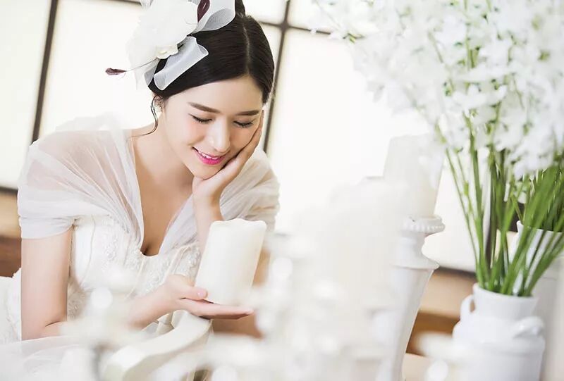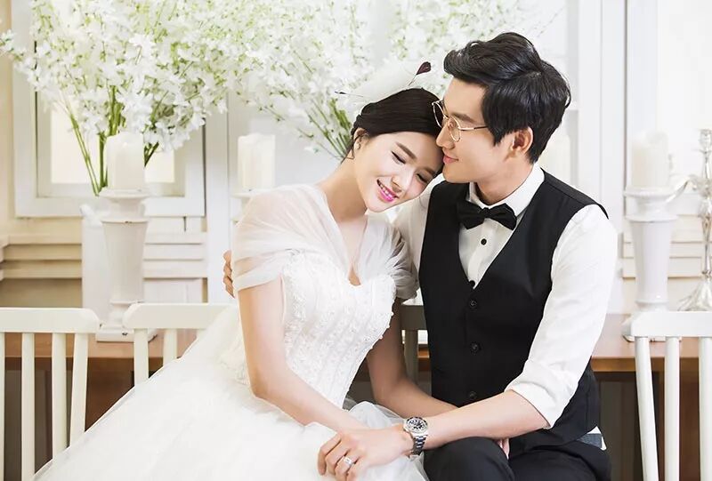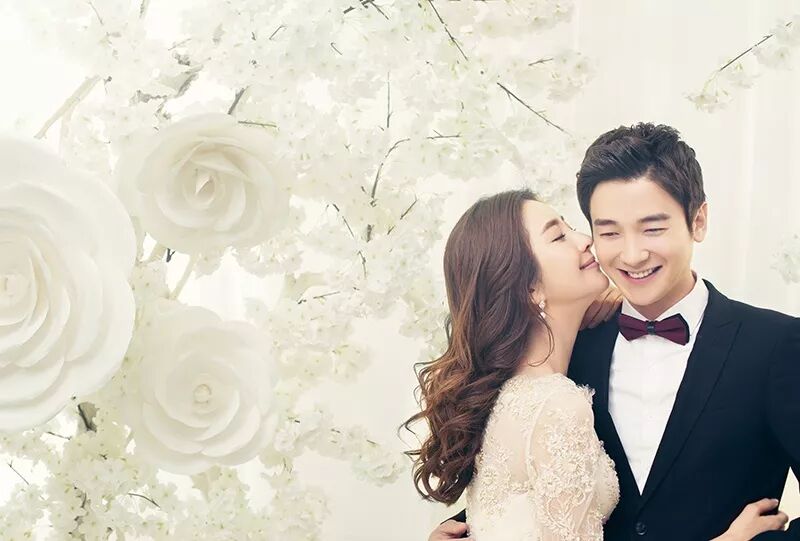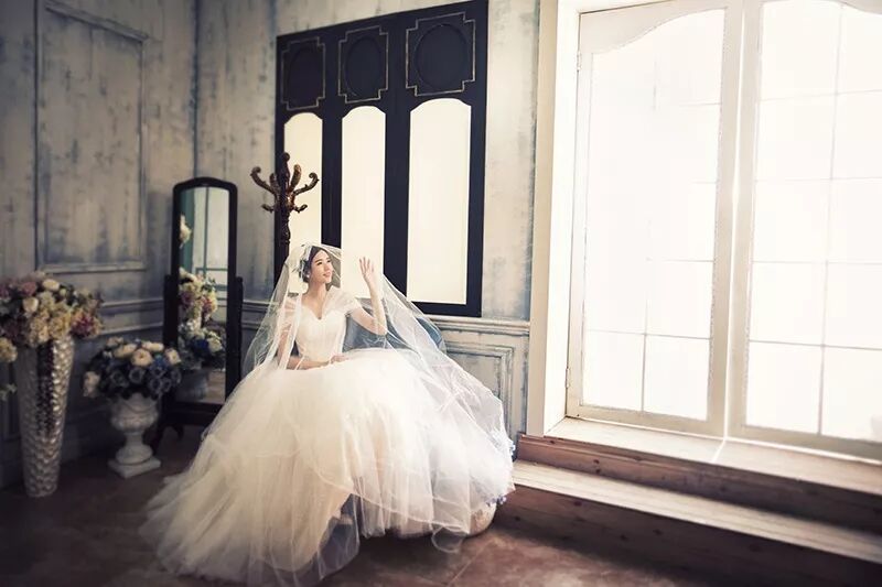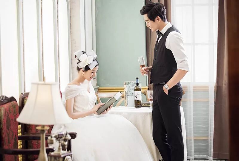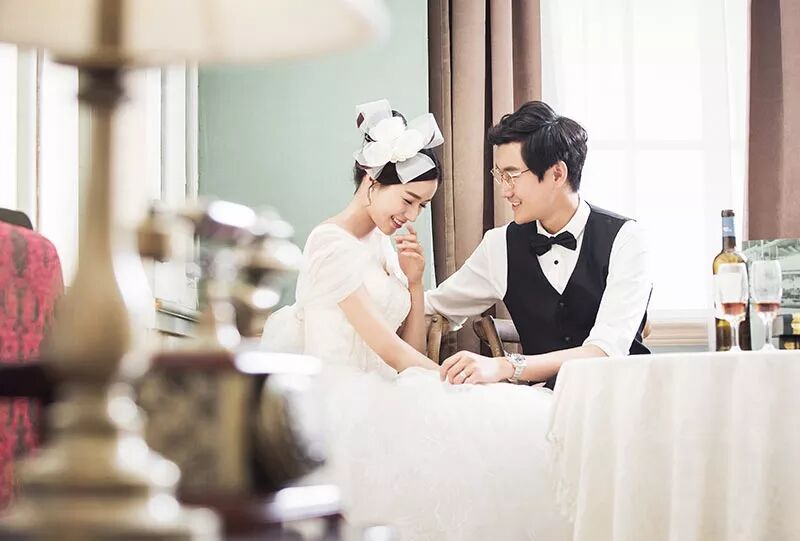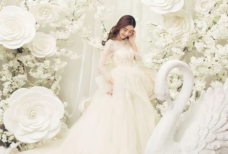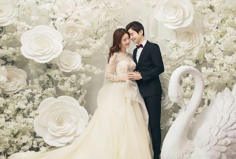 背景道具:韩式主婚纱照多选用渐变色和花纹素雅的扎染布或壁纸作为背景,常搭配花卉、花瓶、镜框等温馨的家居式道具。