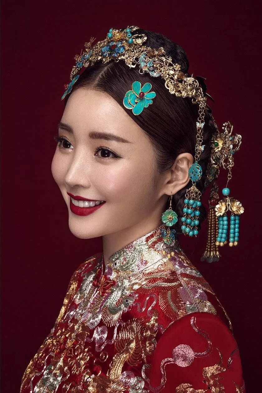 选择中式旗袍婚纱照的新娘一般都会将头发盘起来,选择的是古典式的以发髻为主的盘发发型,这样的发型更能突出中国女性的优雅气质。现在也有新人考虑不用盘头的发型,只要搭配得当也是能将优雅的旗袍穿出韵味。但是不能给头发染色,黑色的发丝更能将东方女性的韵味展现出来。