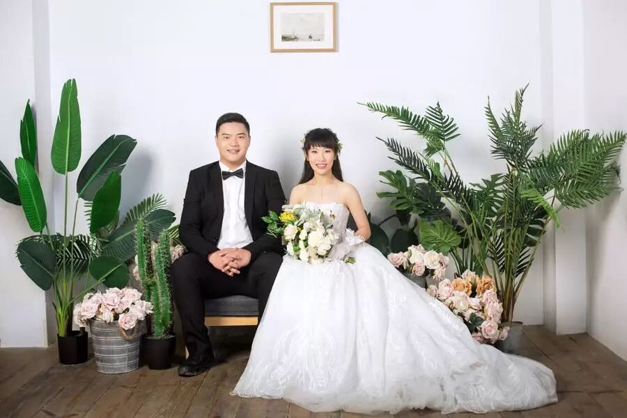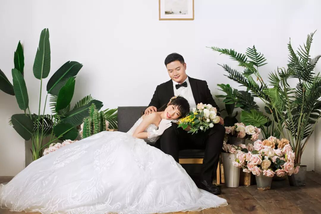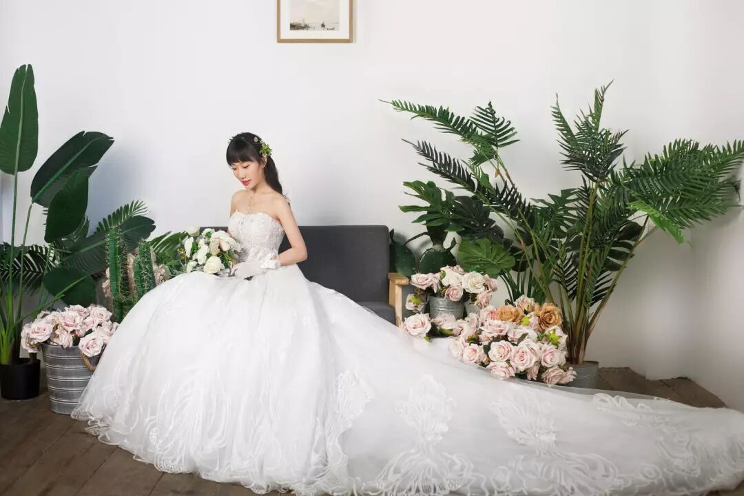 这套也是室内背景,当时预期是拍最正经的婚纱照风格。婚纱是店里的,也不可能做什么改变,所以我只是跟化妆师说希望发型上能用花来装饰。