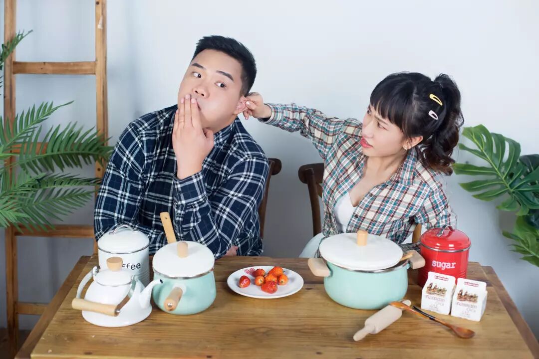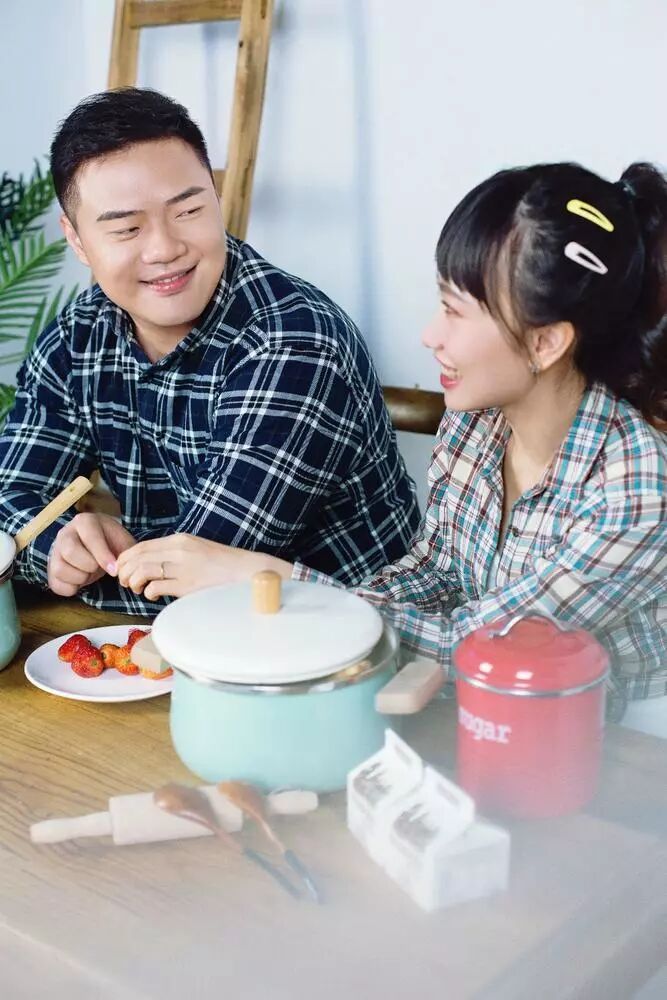 这套照片的背景比较日常家居,所以选了条轻松活泼一些的短裙。预想到时先生会穿自己的格子衬衫,加上我上身比较瘦,直接穿吊带显得更瘦,与先生差别又会很大,所以加了件自己的格子衬衫。