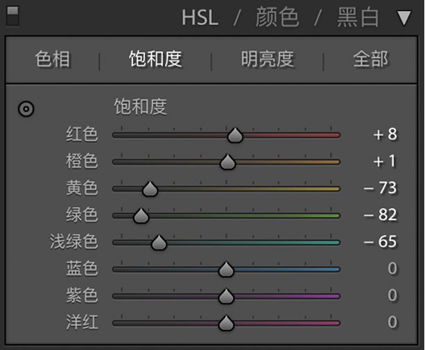 到了这一步整体颜色饱和度还是高一些,通过降低饱和度,提高自然饱和度,使颜色之间的过度更加自然柔和,呈现出高级灰的质感。