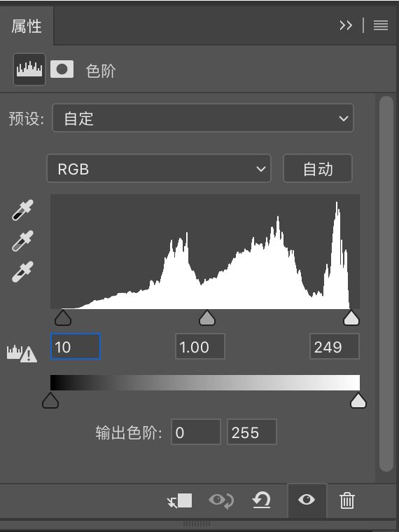 降低高光和白色色阶,还原亮部细节,降低黑色色阶强化黑场。