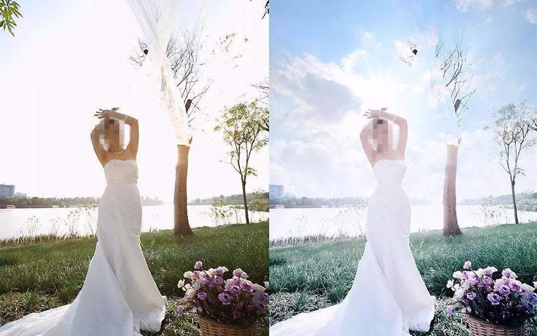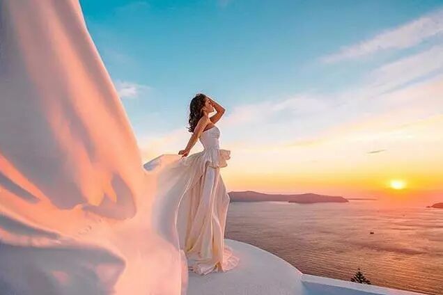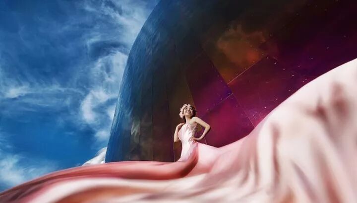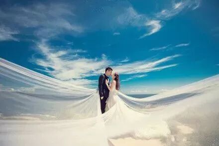 拍海景时,婚纱必须要大,拍出“盘古开天辟地” 的气势。