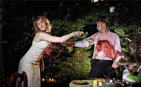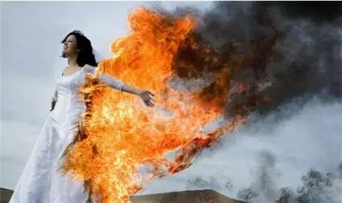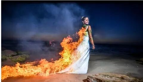 Facebook上有人上传过一段视频,视频里的新娘站在海边并背对摄影师,一位助理引燃了事先洒在沙滩上的易燃液体,大火迅速沿着婚纱裙摆蔓延到整个背部,摄影师随即按下快门,与此同时新娘火速冲向海里保命。