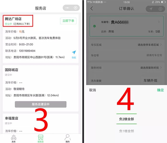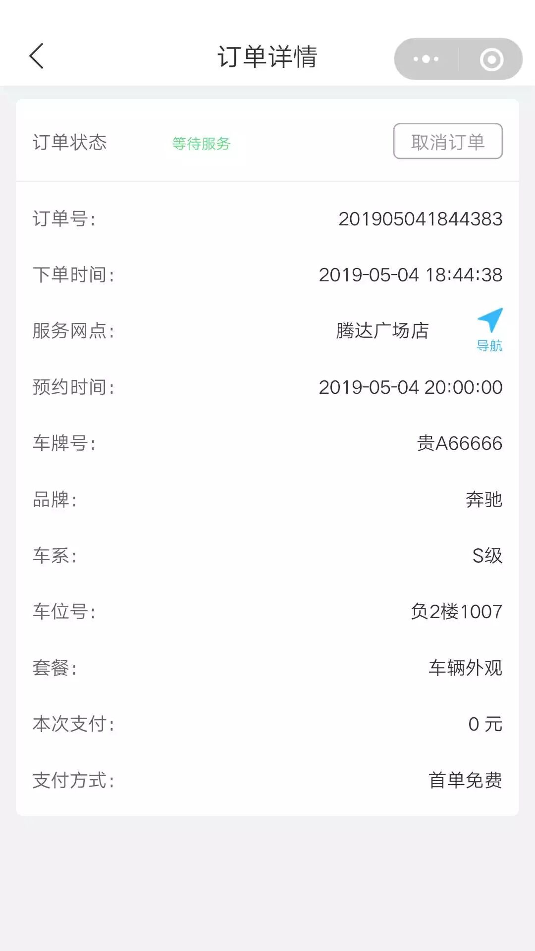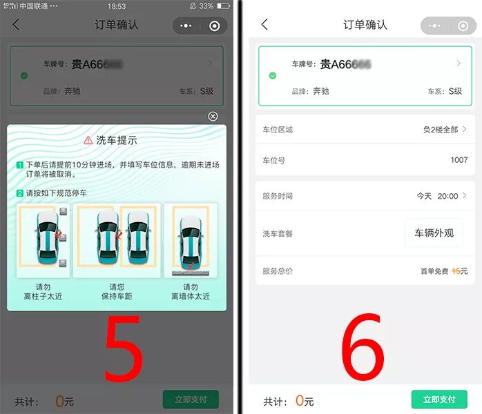 6、输入停车车位号和洗车时间,然后确认下单支付;