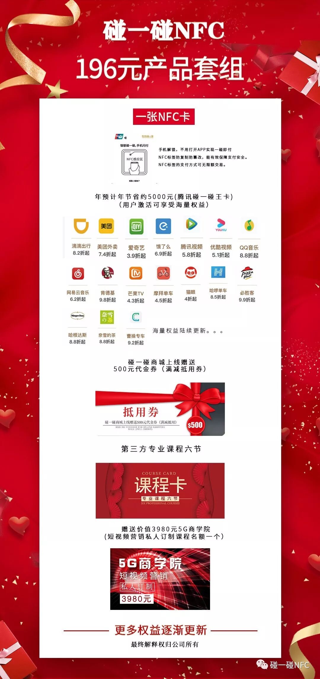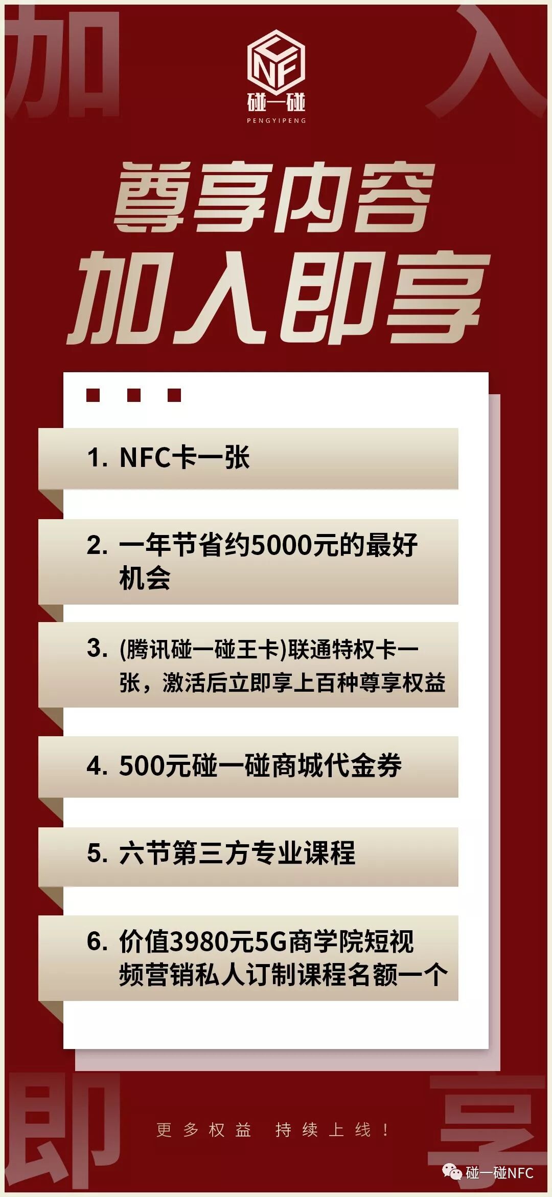碰一碰紧跟5G大趋势,不仅能为用户提供更加便捷安全的支付方式,同时通过腾讯碰一碰特权王卡能够为用户提供带来包含吃喝玩乐、旅游出行、生活购物、休闲娱乐等全面产品权益。