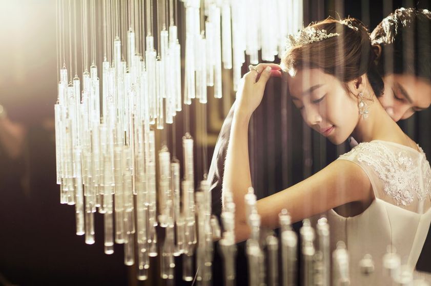 金牛座的婚纱照典雅富贵。金牛座为人可靠,而且爱惜钱财。新娘子身穿白色的婚纱,玲珑剔透的水晶灯装饰,以一种比较暗的背景,突显出富贵之气,看上去比较典雅。