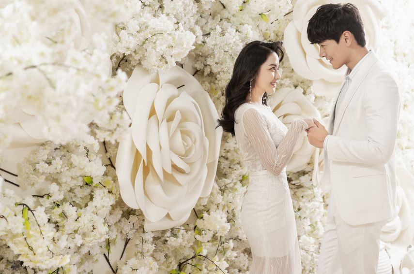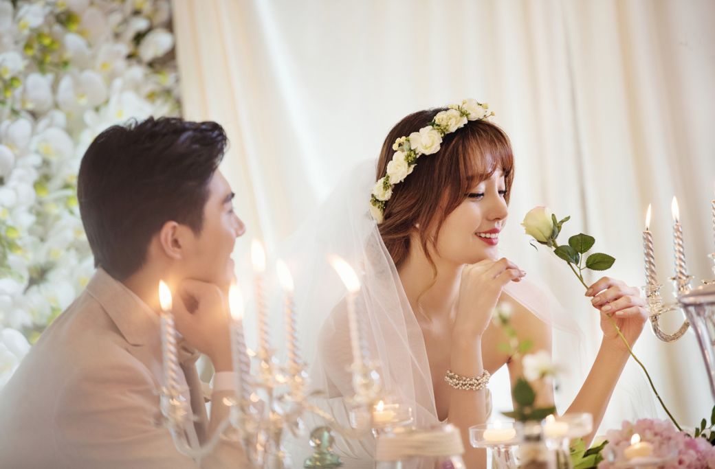 巨蟹座的婚纱照天真自然。巨蟹座的人计较顾家,以后一定是个贤妻良母型。修长的头纱配上优雅的花饰,让人看上去像个小公主,背后的洁白的花墙,浪漫的珠光,彰显女主人温柔娴熟气质。