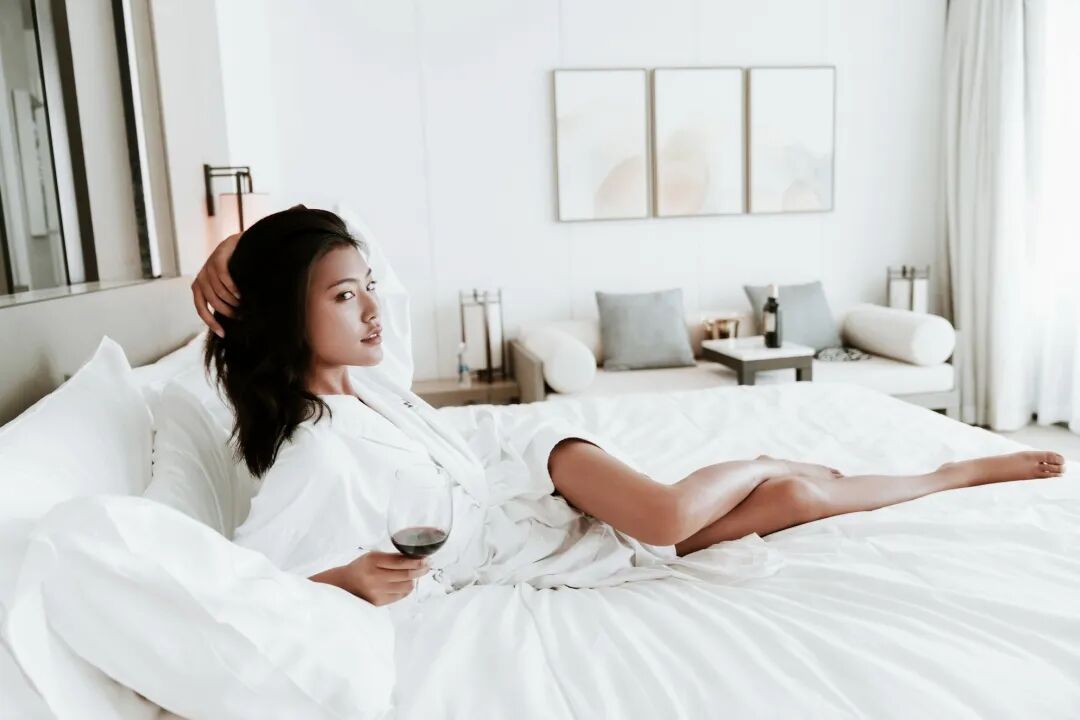 浴袍照和早餐最搭,羊角包、水果拼盘、橙汁咖啡都是很上镜的。报纸,书本,红酒杯这些道具也都可以用起来,不知道怎么摆pose的时候借助道具就可轻松解决。