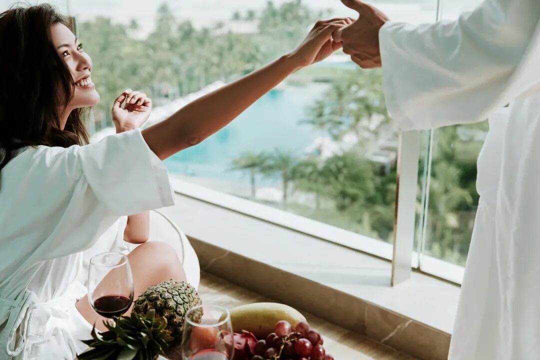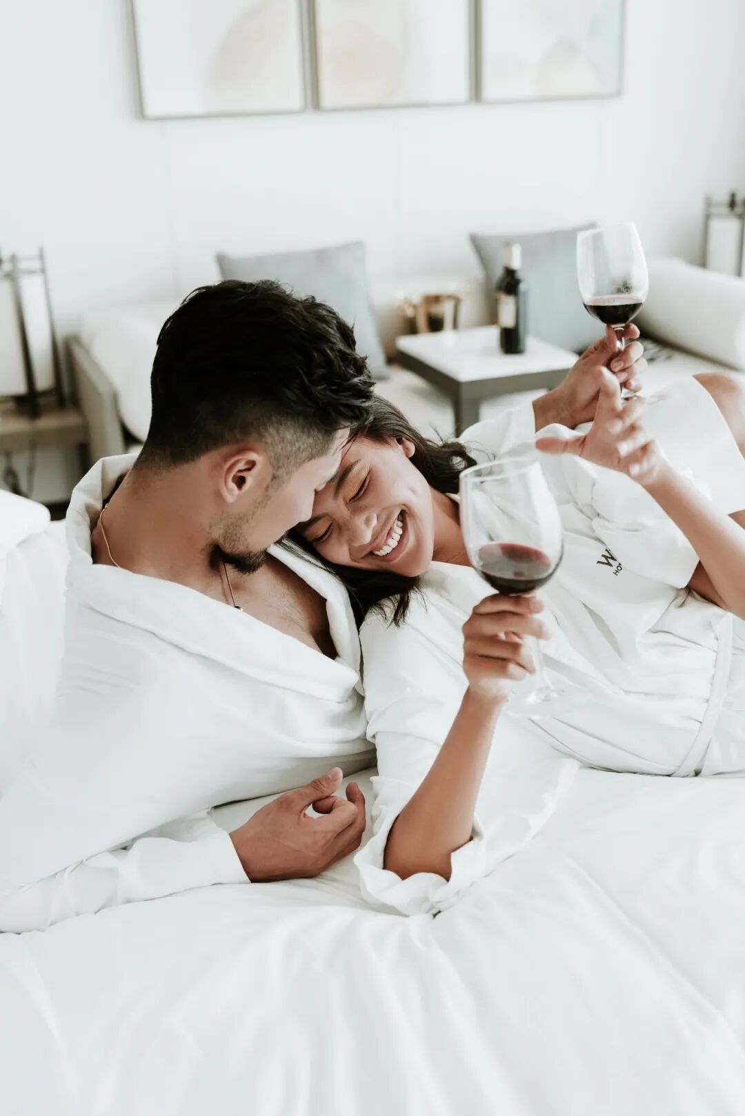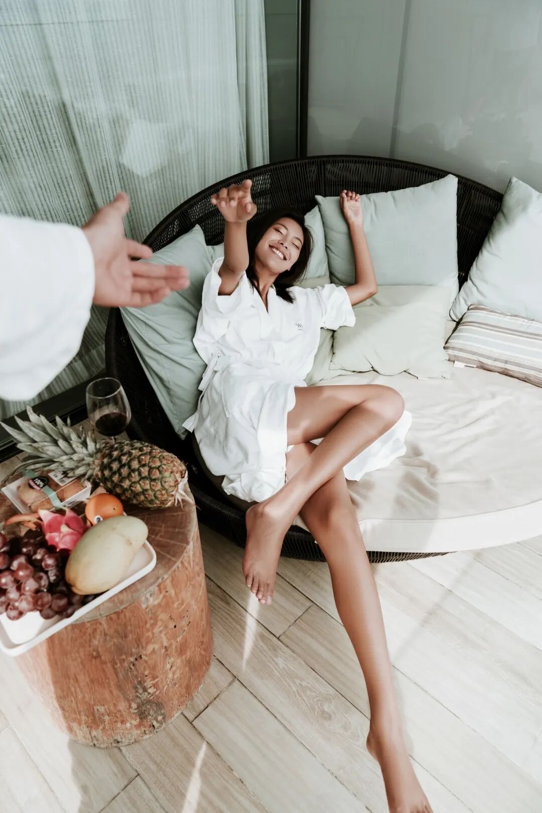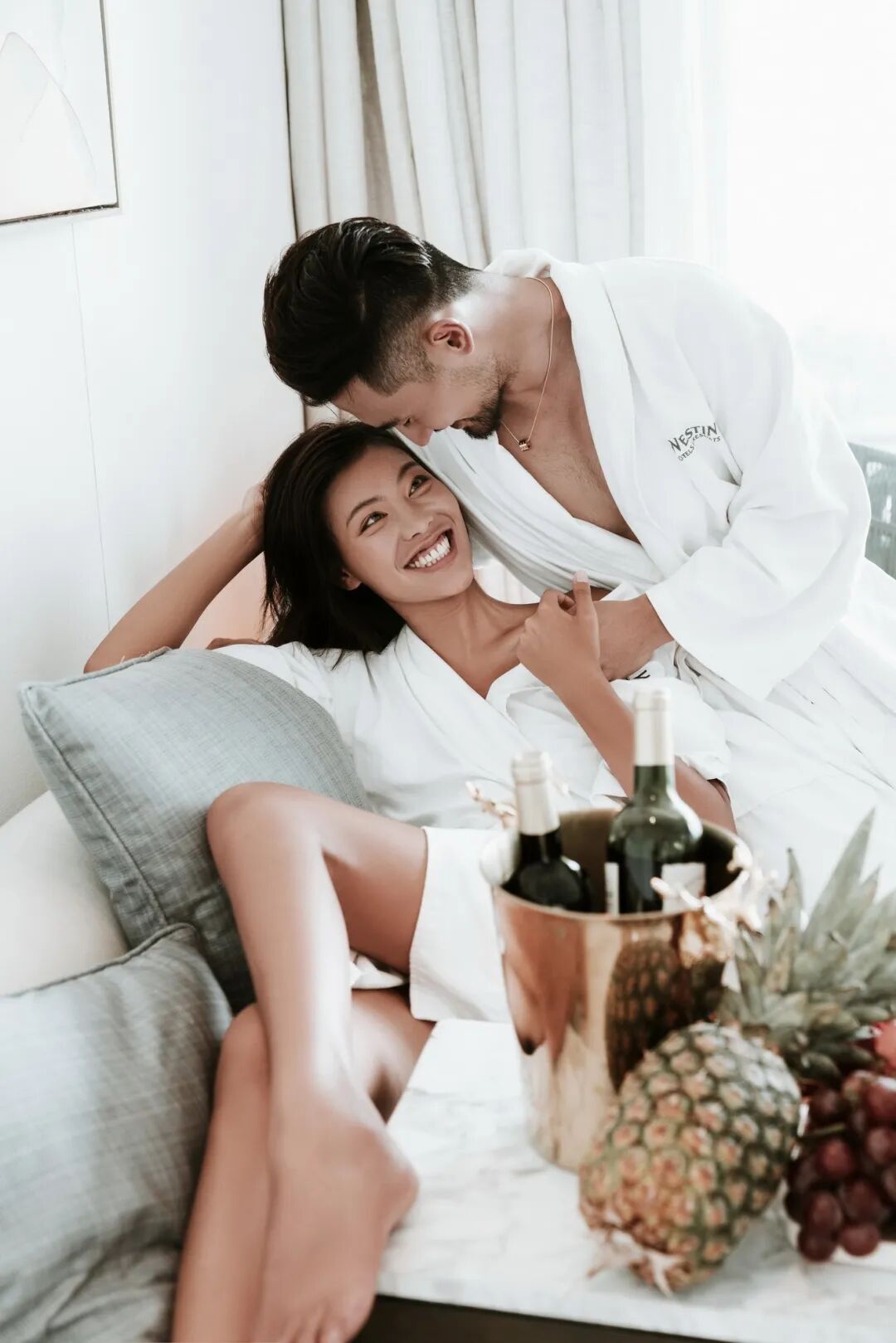飘窗、沙发、阳台是出片的好地方,万能的浴缸和床上也可以拍一拍。两人可以多一点互动,或高贵冷艳,或生活化的甜蜜互动,站着、坐着、躺着、翘腿皆可。