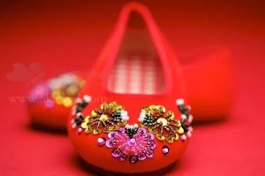 穿褂裙要露出鞋面,所以不能穿太高跟的鞋,否则不好看,一般都是穿红色绣花鞋。