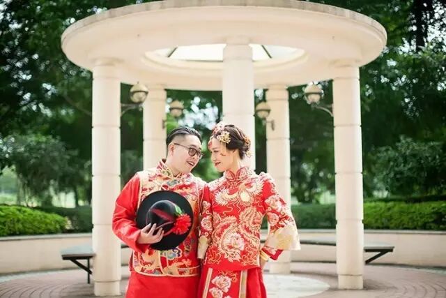 龙凤褂:常用于西式婚礼、新中式婚礼的迎亲、出门、敬酒环节。仪式环节可更换为婚纱。