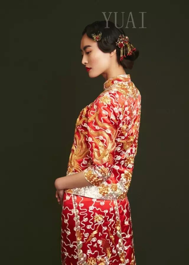 造型以盘发为主。饰品选择同样多用发簪、金饰、玛瑙等中国风饰品来装扮新娘。袖长不能过长,露出宽宽的黄金龙凤镯为佳。