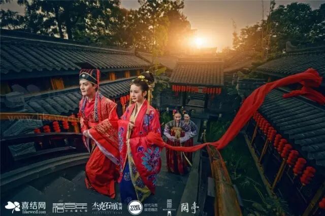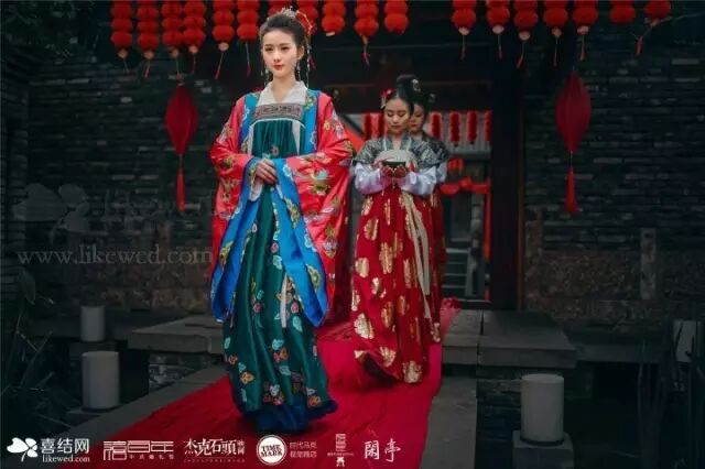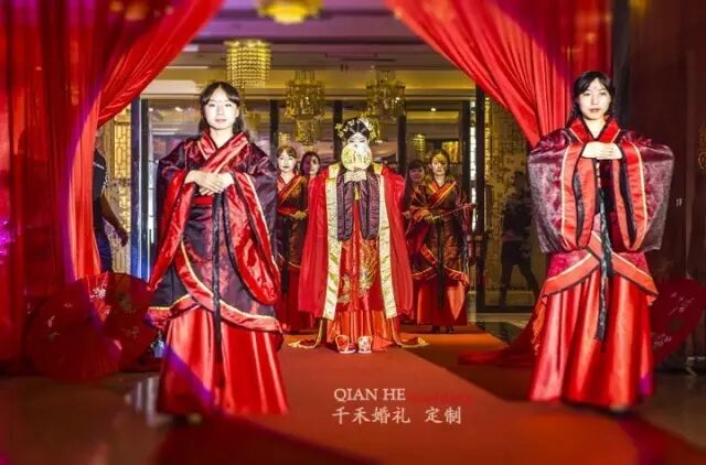 汉服:适用于纯中式婚礼所有环节,根据婚礼风格(制式)选择相应服装。