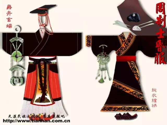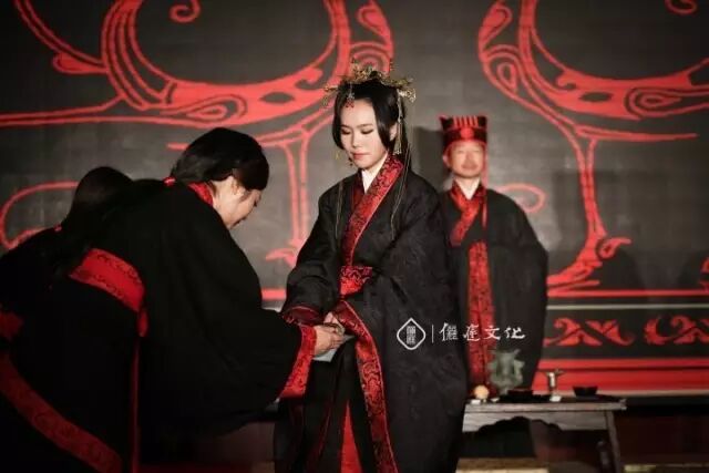 婚礼秉承周代仪制,身着周制婚服(玄端),古典幽雅、庄重肃穆;那时候的婚礼还叫做昏礼,取“黄昏举礼之义”。昏服的色彩循“玄纁制度”,取天地间最高贵的色彩为之。