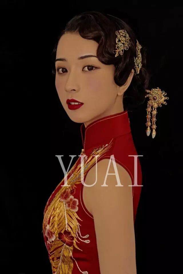 发型以中式古典盘发和发髻为主,重在表现女人古典的优雅美。复古的波浪式刘海是中式旗袍造型中教具代表的特征。头饰以小型的饰品,珍珠类的发饰为主,有助于提升整体造型古典优雅的气质。