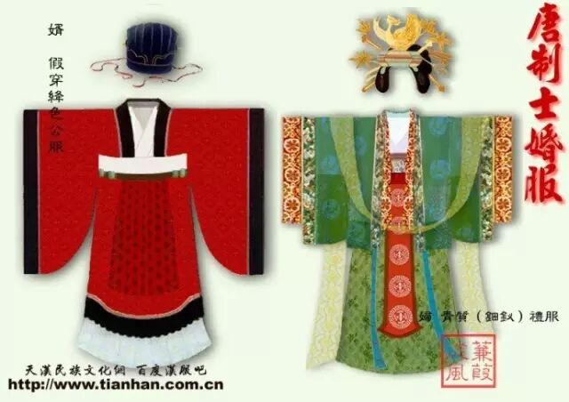 假绛公服亲迎,有人认为这是红色婚服的起源。女服“花钗青质连裳,青衣革带韈履(同裳色。夫有官者则从其夫之品服)”。即青色的深衣,饰以以金银琉璃等钗饰。大胆的色配冲撞,不愧是绚丽的大唐气象,同时 唐制士婚服也造就了“红男绿女”这个成语。