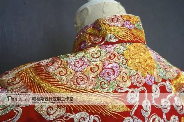 龙凤褂剪裁吸收了西式服装特点,刺绣色彩多以金银色为主,图案也多采用龙飞凤舞,十分的亮丽华美,每一件均是纯手工一针一针缝制的。