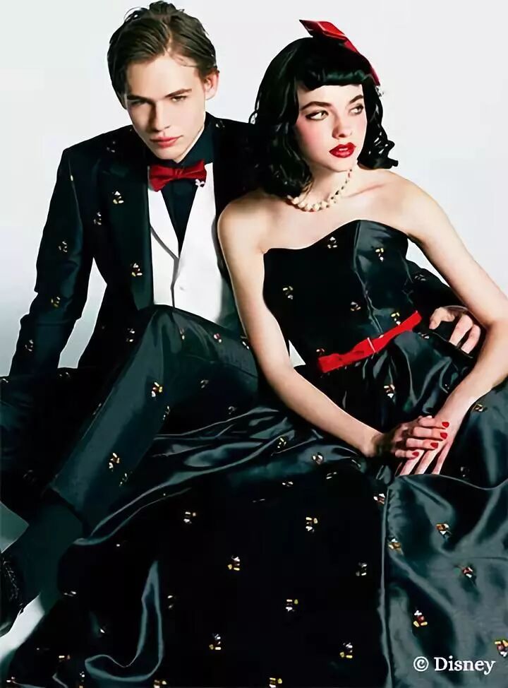 这套米奇婚纱真的超可爱,白色的绸缎布料上有着满满的米奇刺绣,小小的图案带着满满的童真,却又不会过于幼稚,男生的礼服也是经典的西装样式,非常适合婚礼晚宴!