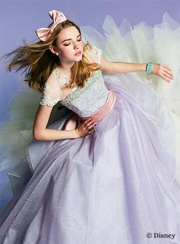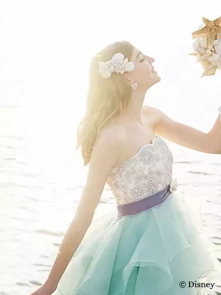 清爽的蓝绿色裙摆作为主色调,加上浅紫色腰封以及珍珠刺绣的上身设计,充满了海洋情调,非常有小美人鱼的感觉。