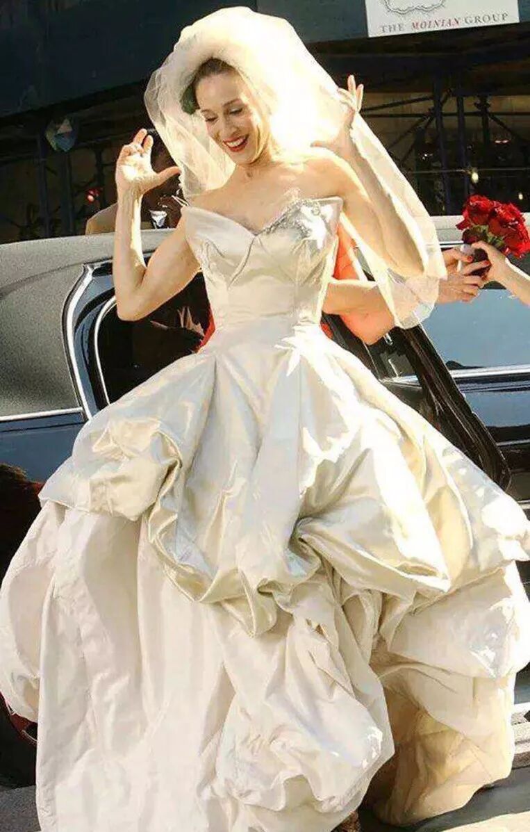 无论是在审美趣味、消费观念和消费方式上,千禧一代和 Z 世代的新娘们早不同于上一代。1998 年播出的剧集《欲望都市》中 ,Carrie 和 Mr. Big 结婚前夕试穿婚纱的那一幕令不少人印象深刻。Vera Wang、Carolina Herrera、Christina Lacroix、Lanvin、Dior、Oscar de la Renta、Vivienne Westwood 等高级婚纱品牌轮番上阵,看上去就像洒满糖霜的蛋糕或层层绽放的白玫瑰。Carrie 最后在选定 Vivienne Westwood 时兴奋地说:“它是一条特别到能让不相信婚姻的人落泪的婚纱。”