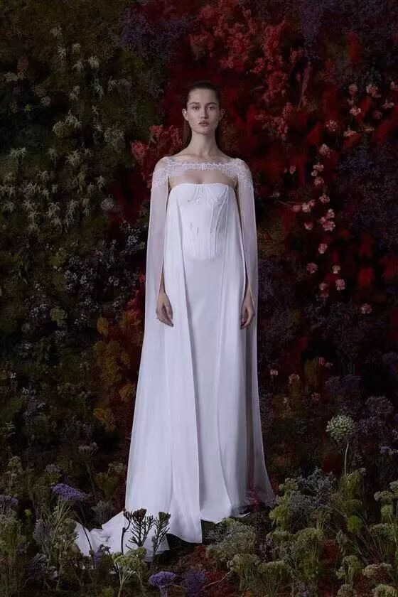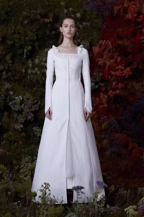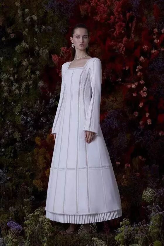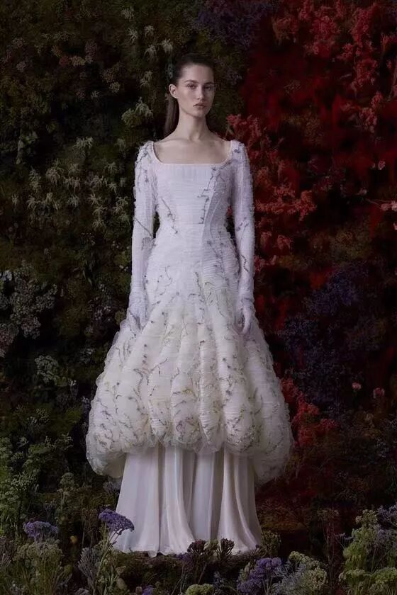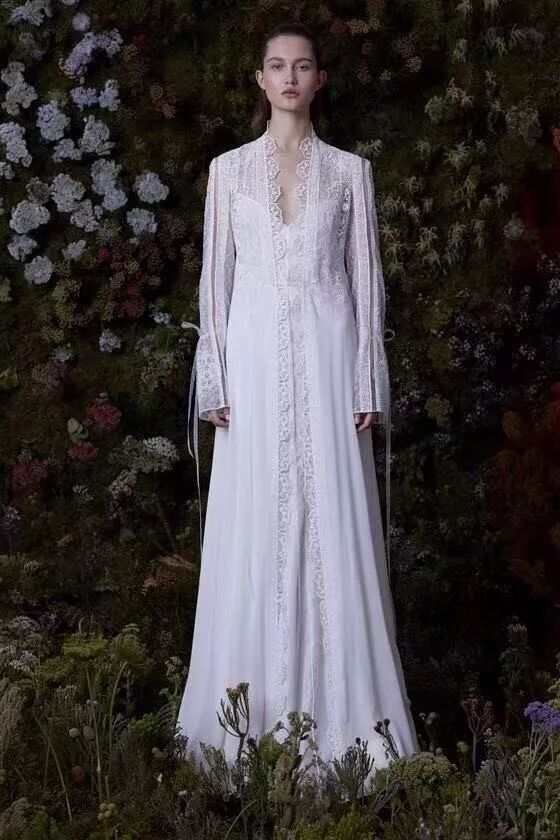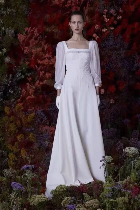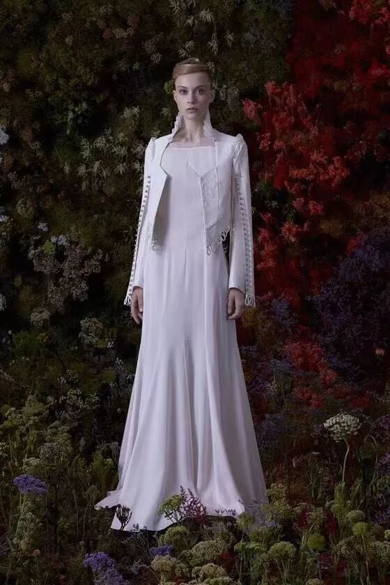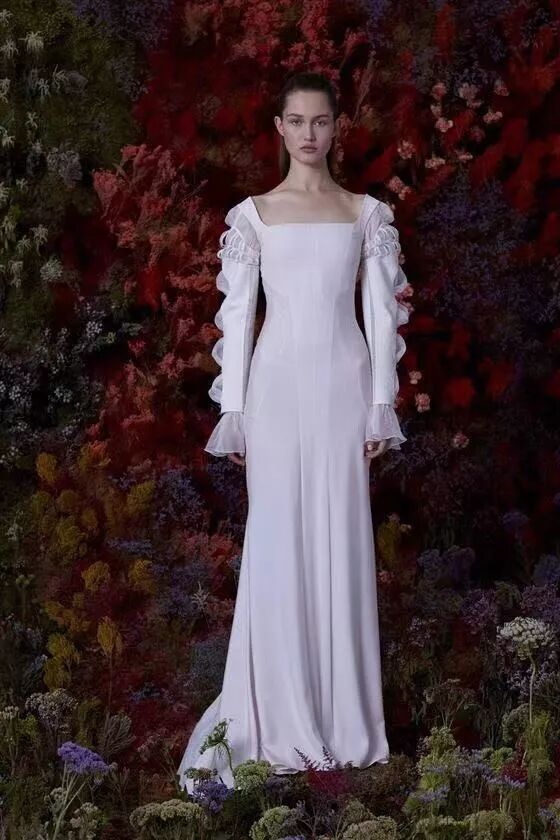 2020/21秋冬最具创新力设计的婚纱 最初的婚纱,设计不很复杂。就是垂直线条的高腰长裙。后来婚纱款式变成长及足踝的样式,前幅裙用直线剪裁,后幅则缀上另一幅拖地的裙摆,当新娘走在教堂的红地毯上时,拖地的裙摆也在地毯上徐徐而过,令新娘有天仙般的风姿。以后的婚纱式样,上紧下宽,低领口被端庄的高领口所取代。