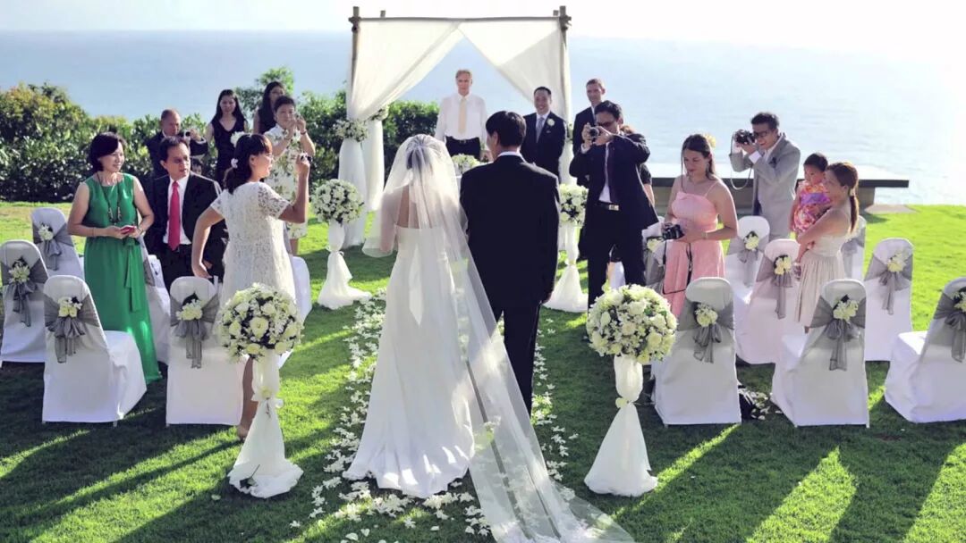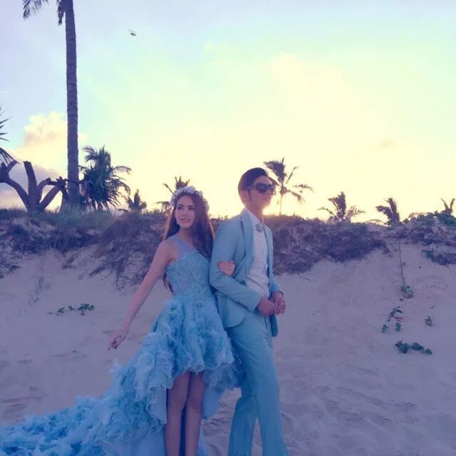 周杰伦的婚礼,海边举行时也穿着浅水蓝色的西服套装。
