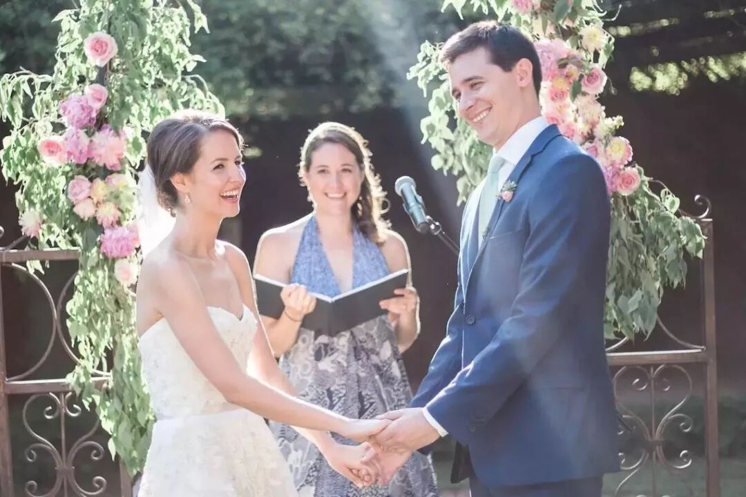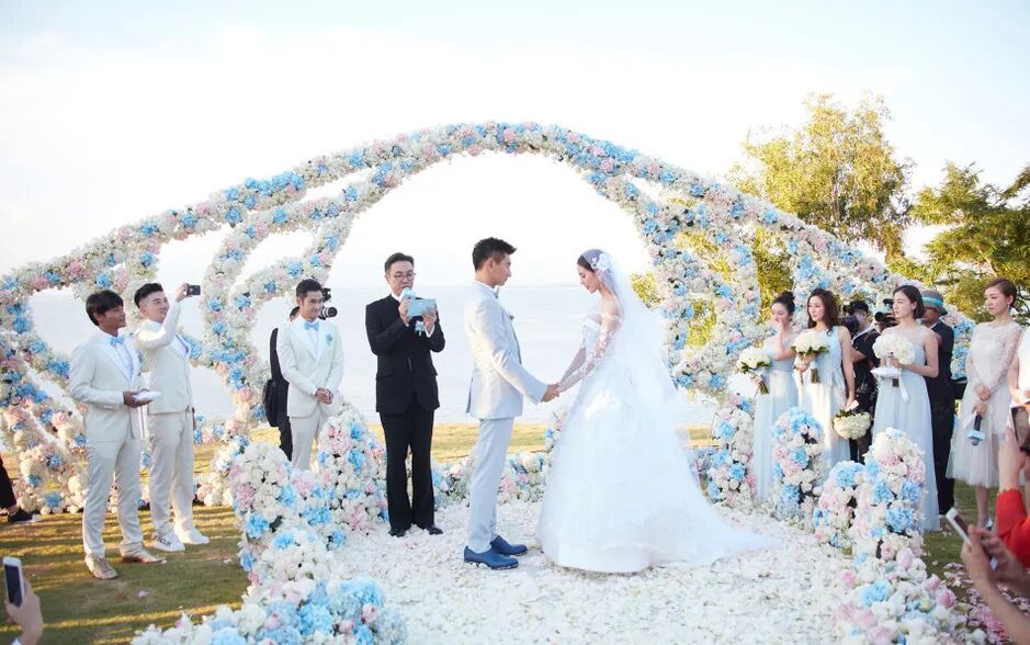 吴奇隆在海边的婚礼,穿着浅蓝色西装,很符合海边的环境氛围。