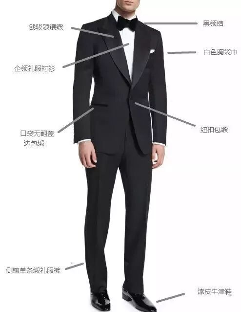 燕尾服是最正式的晚间大礼服。燕尾服上衣形制为前端是折角短下摆,前短后长有尾巴,总衣长近膝;双排扣,枪驳领镶缎,扣子包缎;裤子侧面镶缎(燕尾服要镶双条缎)。