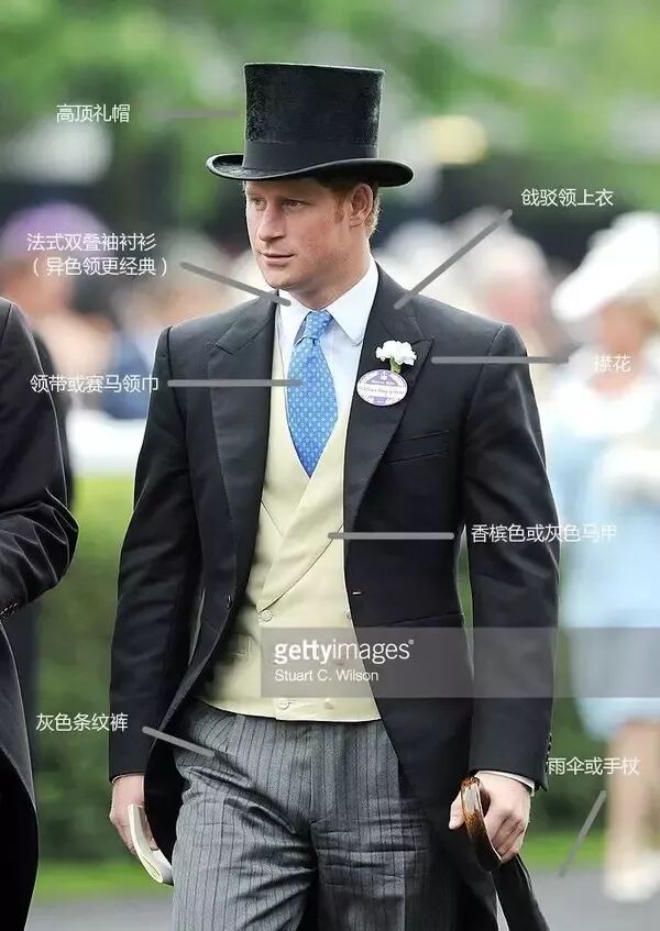 配件:企领法式衬衫或异色领法式衬衫,如果穿翼领礼服衬衫则要搭配Ascot领带;马甲(灰色、香槟色皆可);黑色三接牛津皮鞋(非漆皮的哦,用最常见的牛皮光度即可);Ascot领带或者普通领带;高顶礼帽和手杖(非必须)。