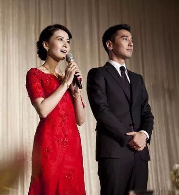 在高圆圆换上中式红裙后,赵又廷也换上了戗驳领、单排两粒扣的黑色套装与中式红裙相呼应。