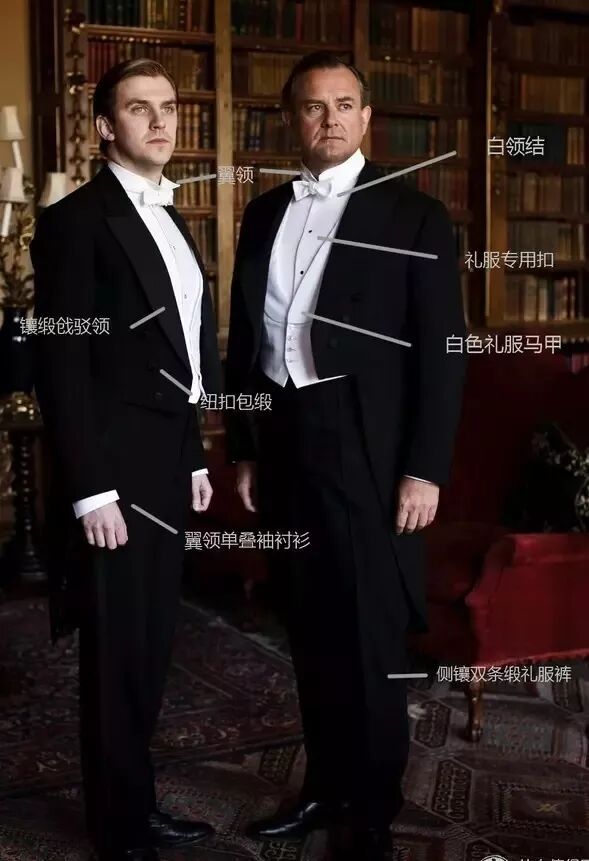袁弘和他的伴郎团接新娘时,穿的就是英式塔式多礼服。典型特征是戗驳领、单排扣,缎面包边,黑色领结。这种礼服是由燕尾服演化而来,可以看出英国人对燕尾服传统的忠诚继承,以及不愿放弃绅士传统的文化符合。
