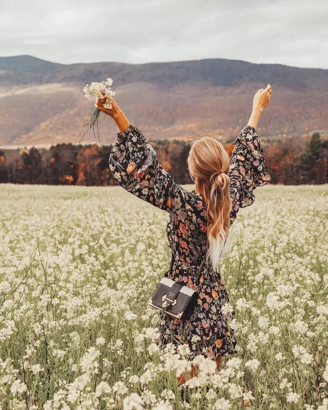博主Leonie的旅行照中也不乏印花的穿搭,富有女性气息的花朵印花穿上甜美感十足,在开阔的风景中,大片印花显得更为热情大方。