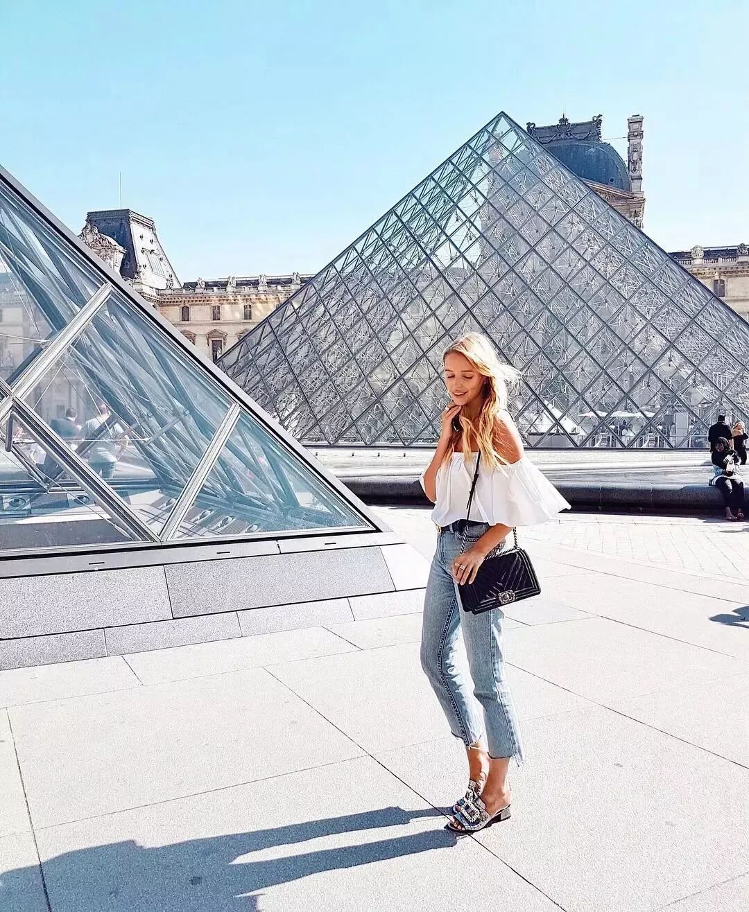 Leonie很喜欢露肩上衣+牛仔裤的搭配,露肩上衣给整体搭配带来一点性感和设计感,为不起眼的牛仔裤大大加分!