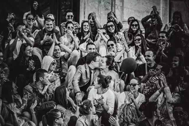 西方人只有在结婚当天才会穿上婚纱,所以我们拍摄时常被误认为是结婚现场,这时路人游客都会毫不吝啬地送出微笑、掌声和祝福。这张照片里,新人被一群学生包围合影,记录下这一刻,也留给一对新人难忘的回忆。
