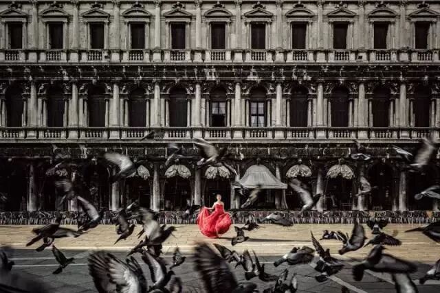这张照片拍摄于威尼斯圣马可广场,镜头水平正对建筑。通过移轴镜头修正建筑的线条,让建筑如传统的舞台布景一样呈现,削弱背景透视感,从而凸显出人物,形成节奏和韵律感。