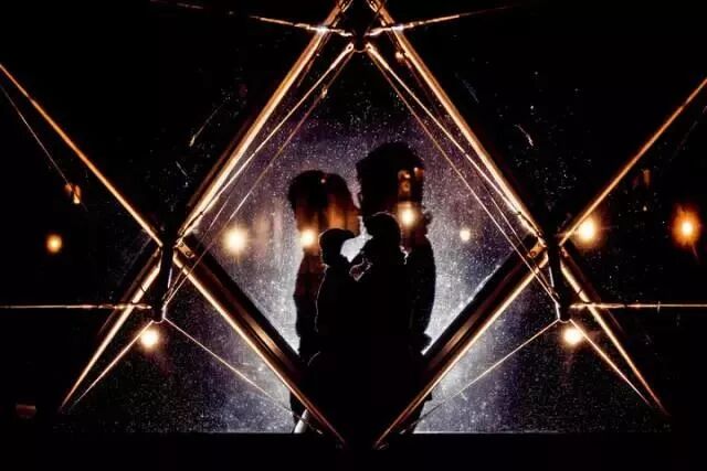 这张照片拍摄于巴黎卢浮宫外,我并没有像大多数人一样采用广角镜头将整个卢浮宫收入画面,而是将新人安排在金字塔的一侧,自己从金字塔另一面透过玻璃用中焦段取景,使人物刚好出现在金属构件的留白处。于是场景被分解成了简洁的点与线,同时让助手在新人身后设置闪光灯,在照亮人物轮廓的同时,在金字塔玻璃上投下了他们的影子,使画面显得扑朔迷离且充满层次。