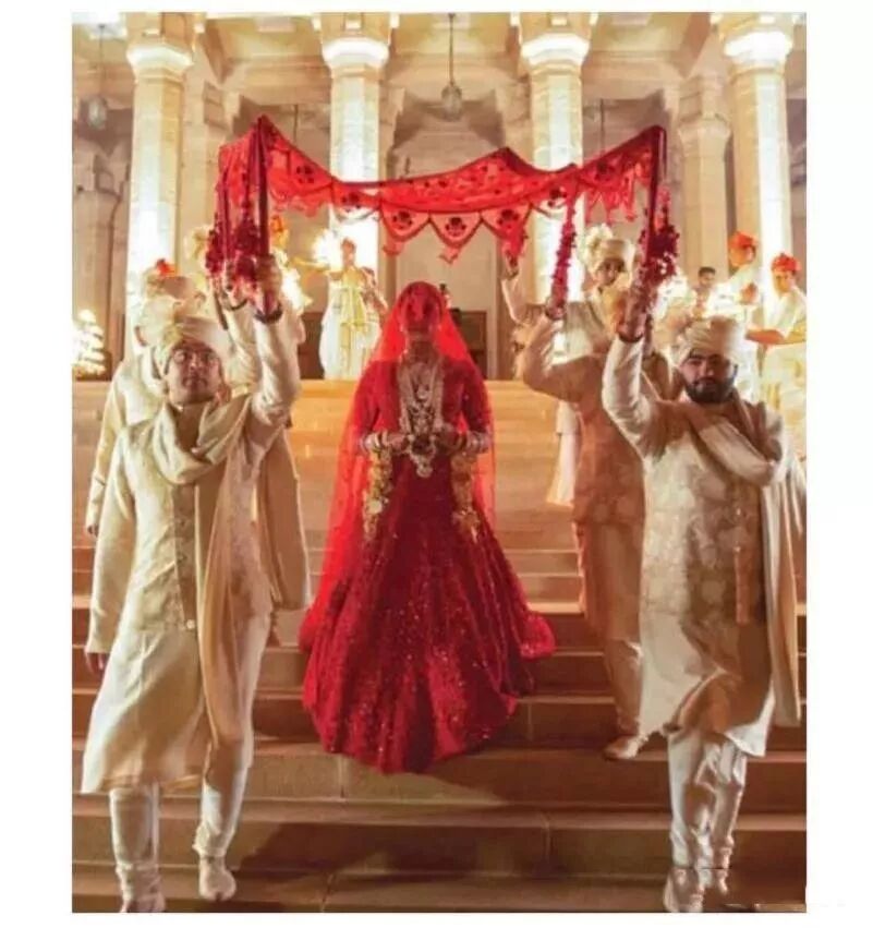 而Nick也穿上了由统一设计师设计的印度新郎装,同样很华丽。