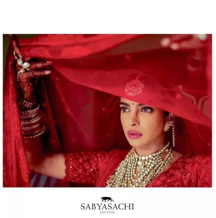 红色的头纱加上各色珠宝的装饰,也把Priyanka身上的印度风情展现了出来。