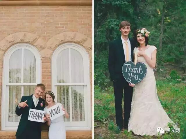 我喜欢当我的新娘和新郎带在拍摄的最后举一些牌子,类似于“谢谢”这种。这些照片可以制作完美的贺卡或者请柬送给所有的客人。在拍摄之前询问他们需要准备的工作,如果这是他们对这些项目有兴趣,这将会是一个非常好的亮点。