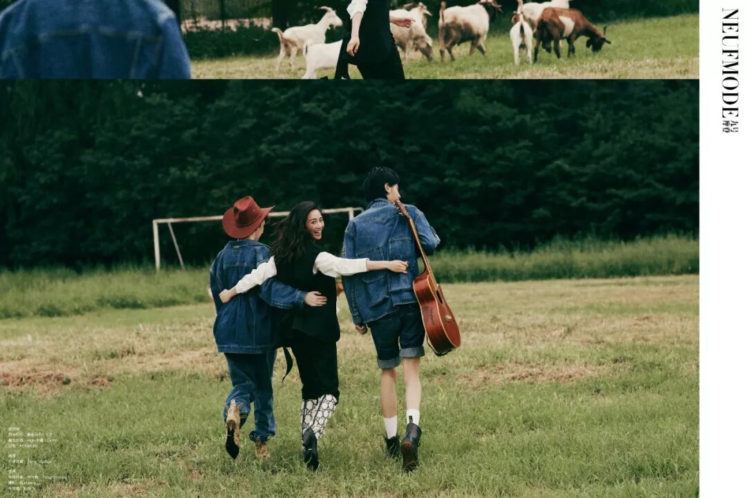 拍摄奔跑在草场上的三人组合