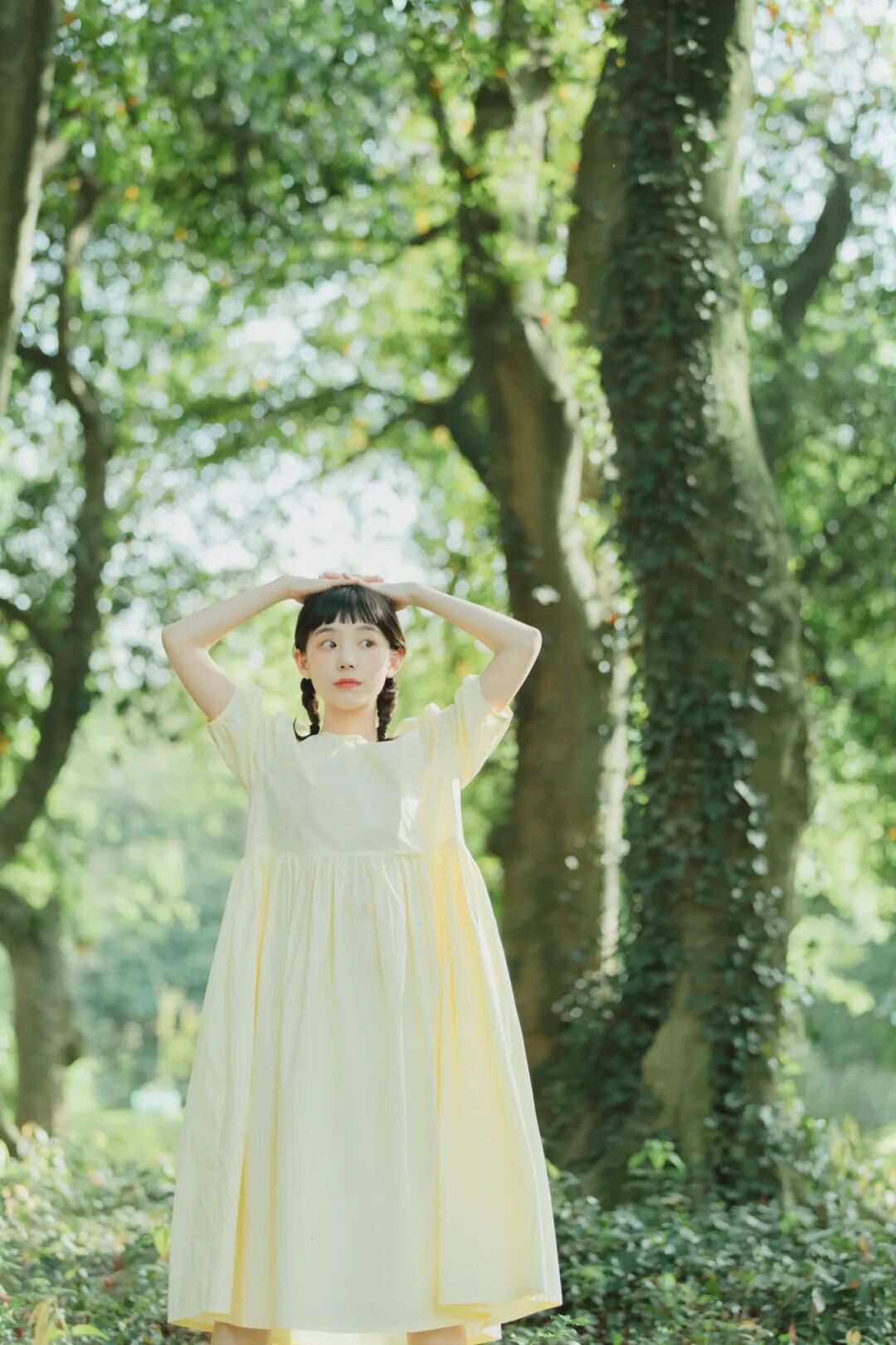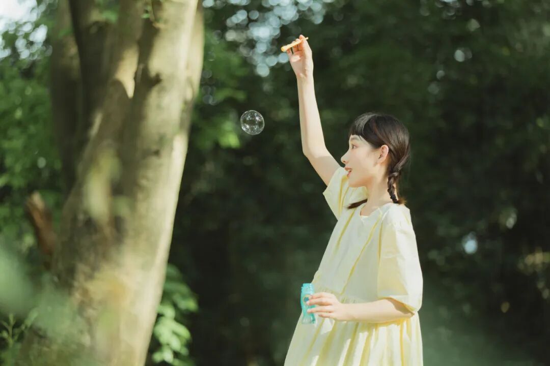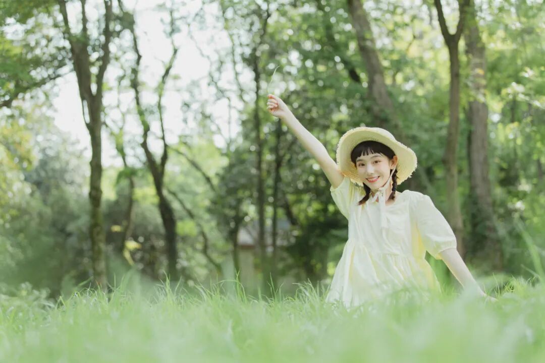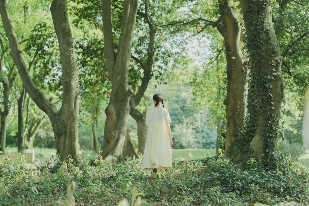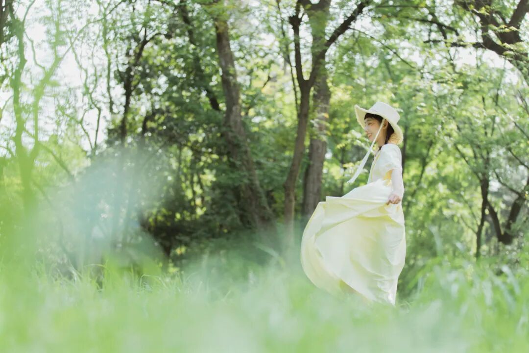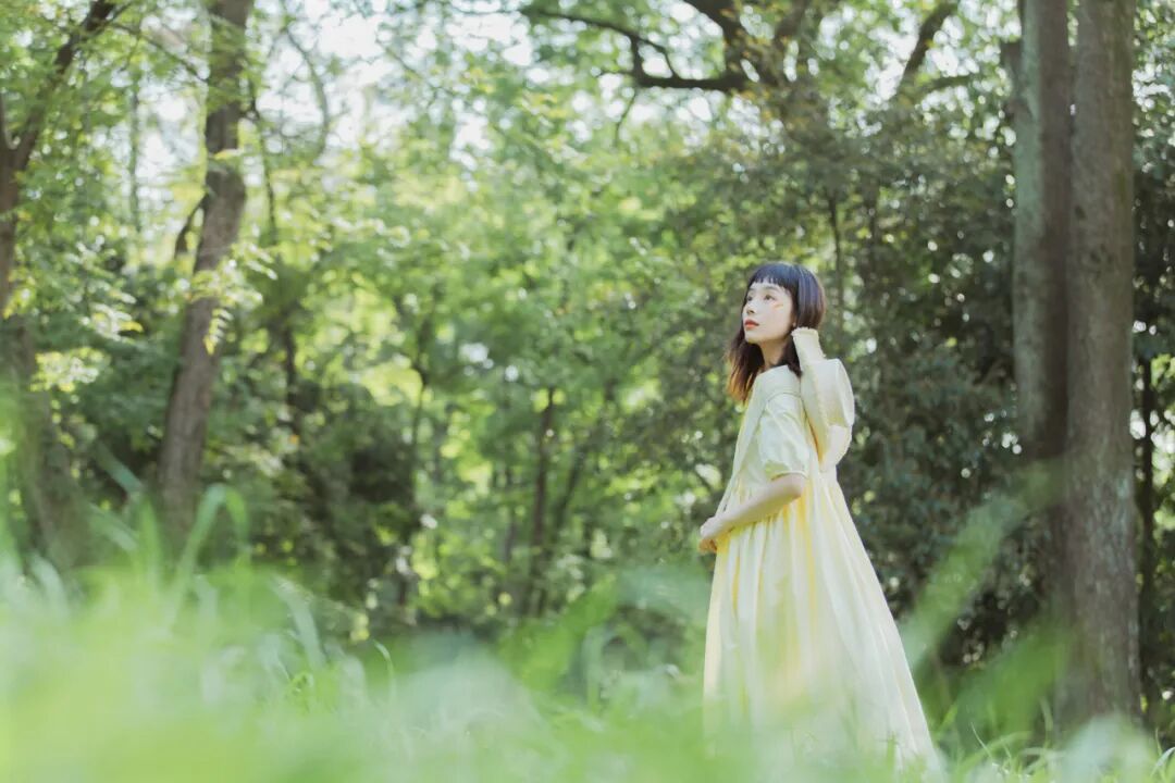 对于一组作品来说,前期是非常重要的,在我确定了主题之后,我首先想要一片大的草坪和树林,所以我把拍摄的地点选在了植物园,服装上想突出少女感和纯色系清淡的感觉,但也要和大面积的绿色相配,因此最终选择了淡黄色,妆容以自然的氧气感为主,去掉了眼线和浓重的眼妆,加重了腮红,更显模特的灵气,构图上以突显氛围情绪的大场景和中景为主,也会适当加入一些特写,后期主要的思路是把色调向黄绿色靠近,营造出淡淡的青柠感。