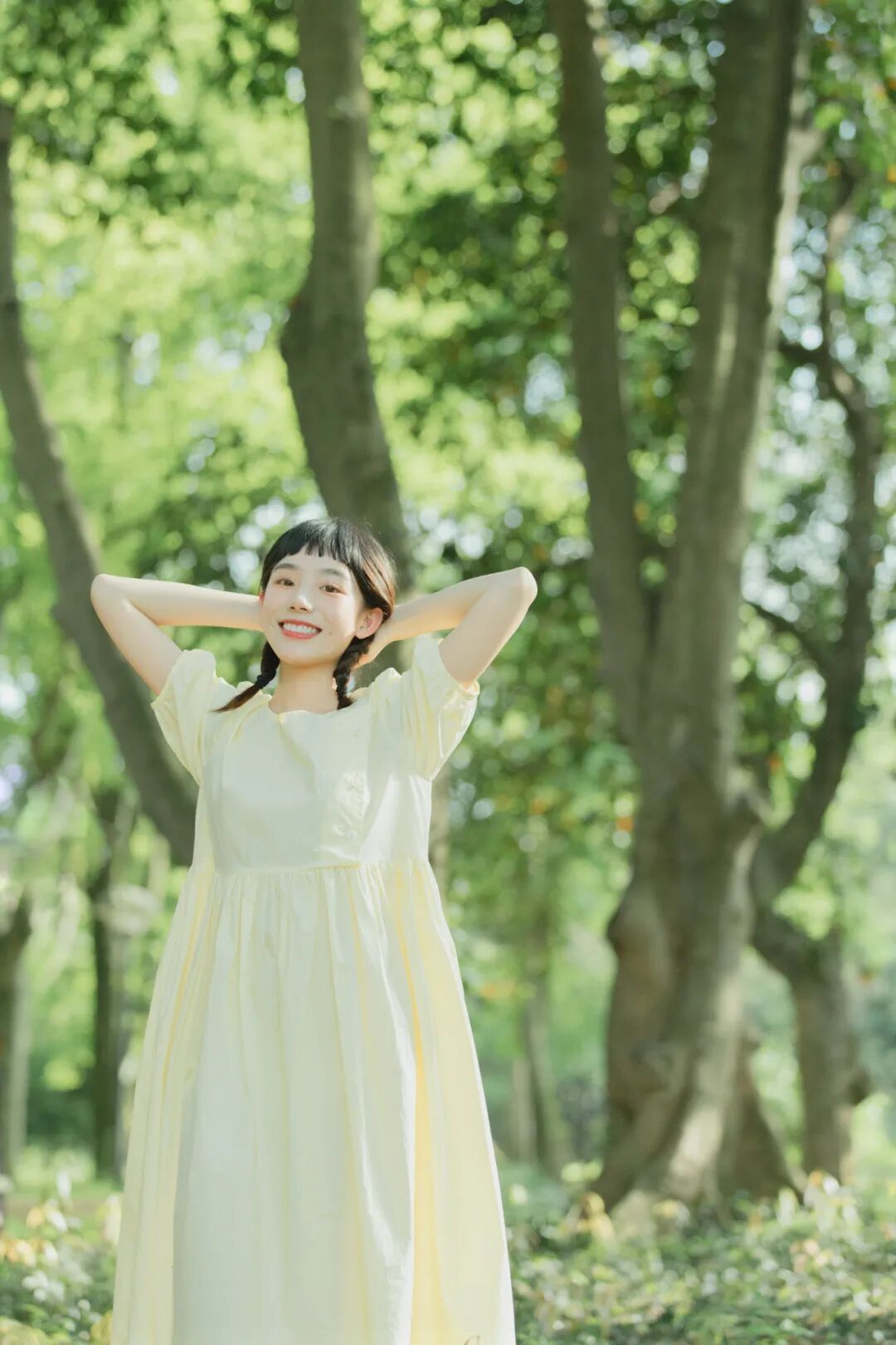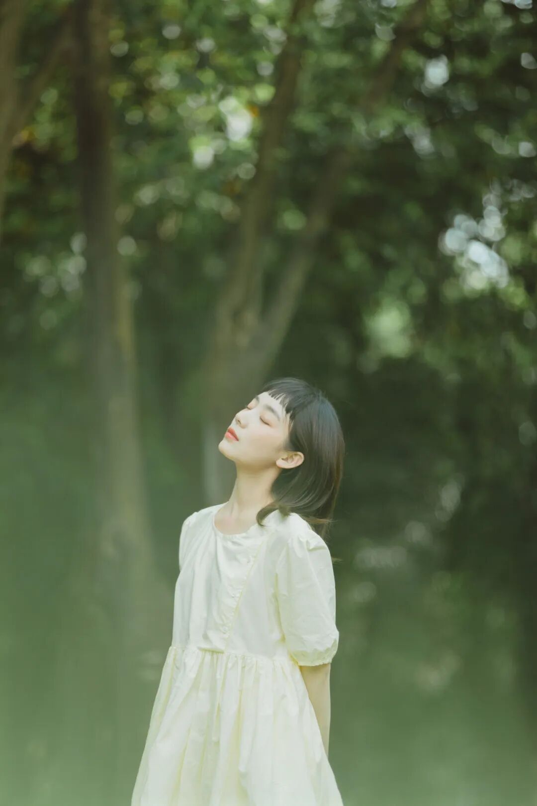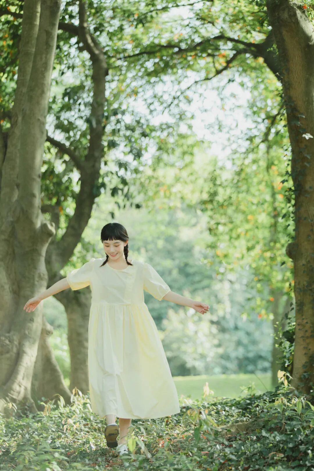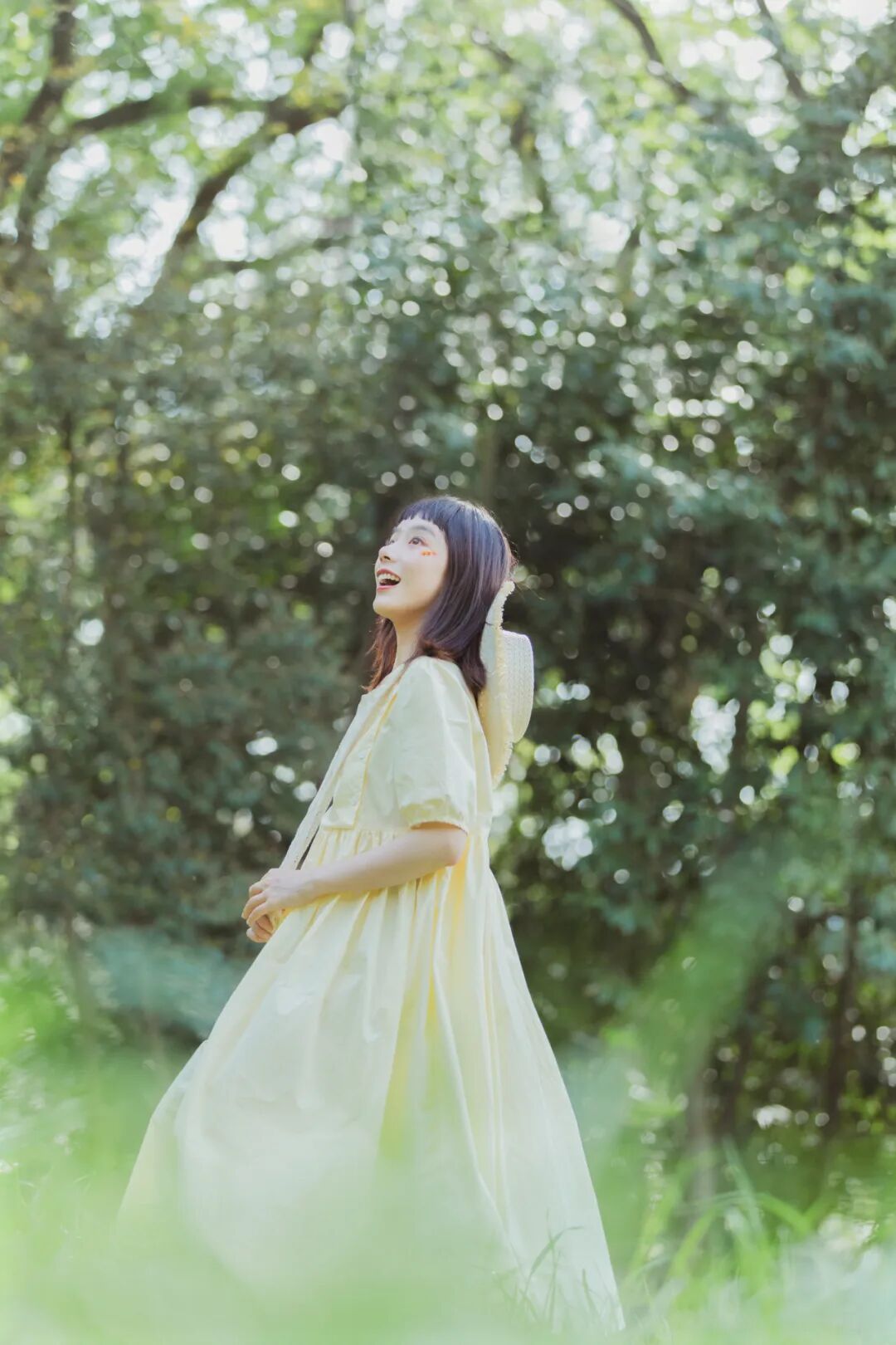 对于一组作品来说,前期是非常重要的,在我确定了主题之后,我首先想要一片大的草坪和树林,所以我把拍摄的地点选在了植物园,服装上想突出少女感和纯色系清淡的感觉,但也要和大面积的绿色相配,因此最终选择了淡黄色,妆容以自然的氧气感为主,去掉了眼线和浓重的眼妆,加重了腮红,更显模特的灵气,构图上以突显氛围情绪的大场景和中景为主,也会适当加入一些特写,后期主要的思路是把色调向黄绿色靠近,营造出淡淡的青柠感。
