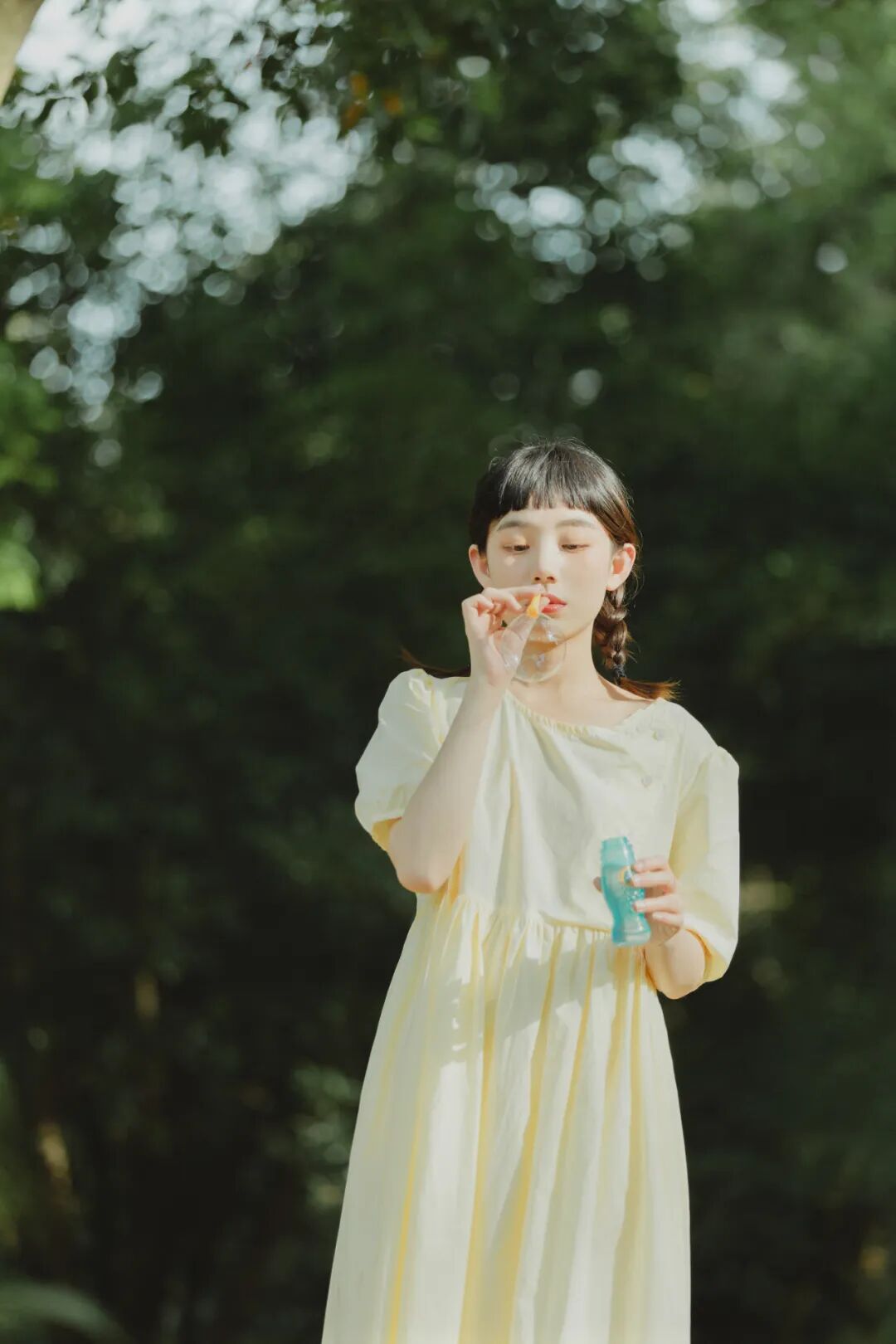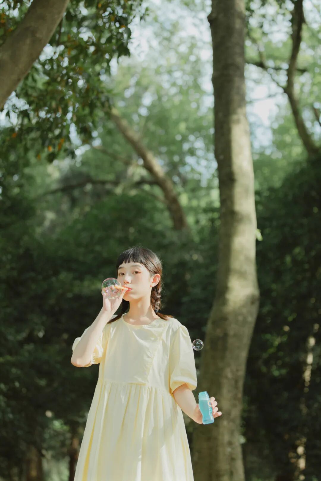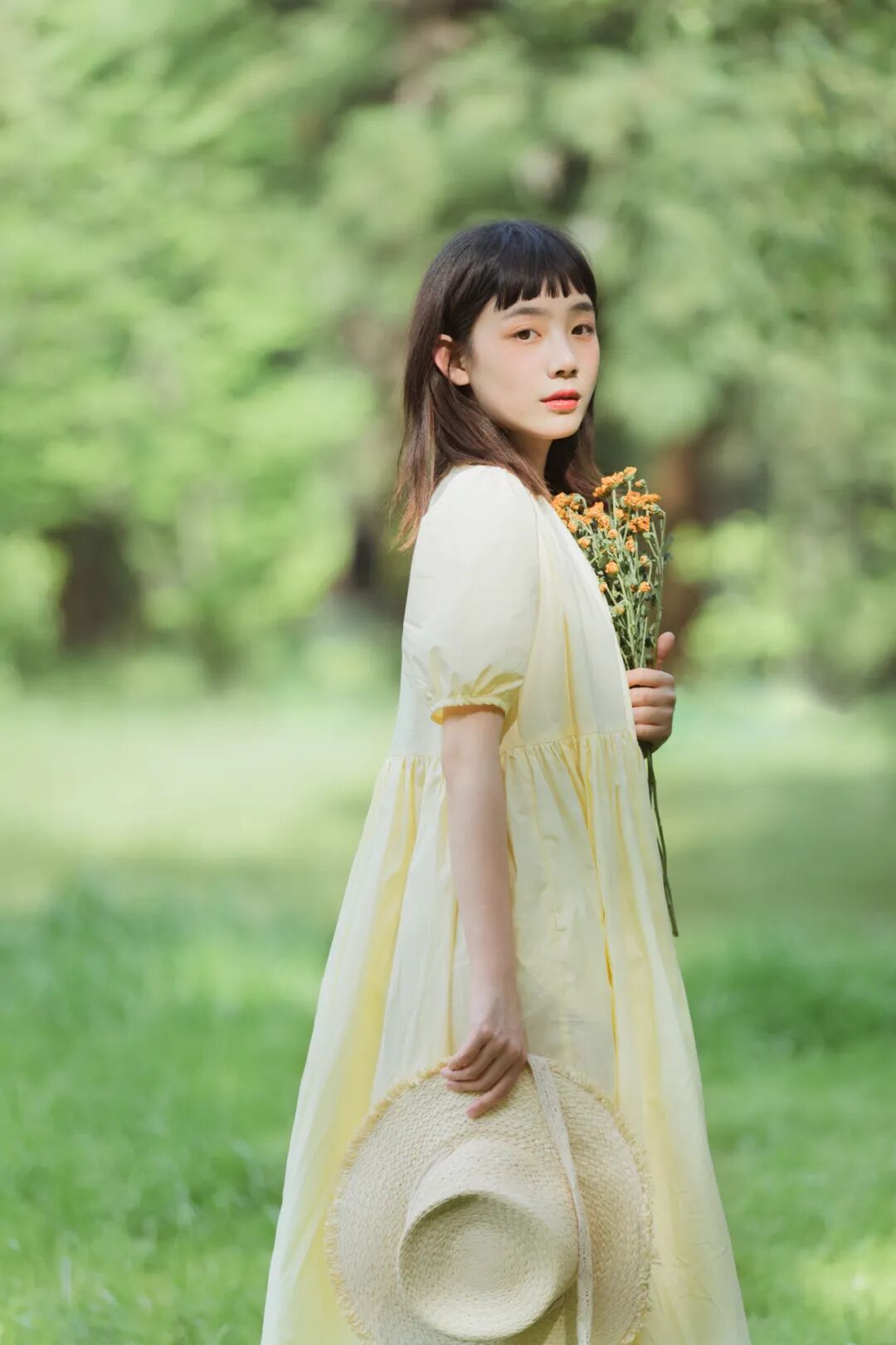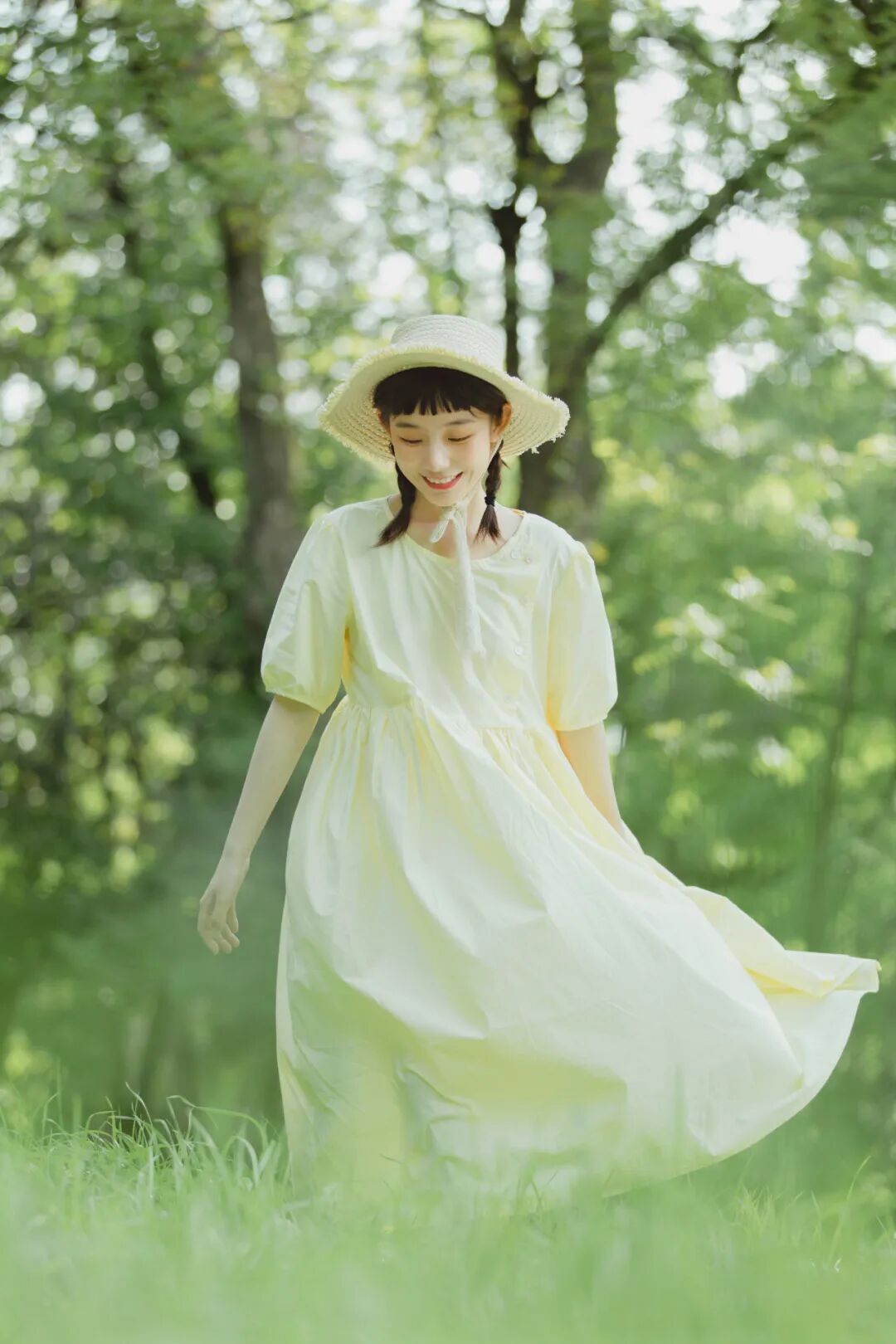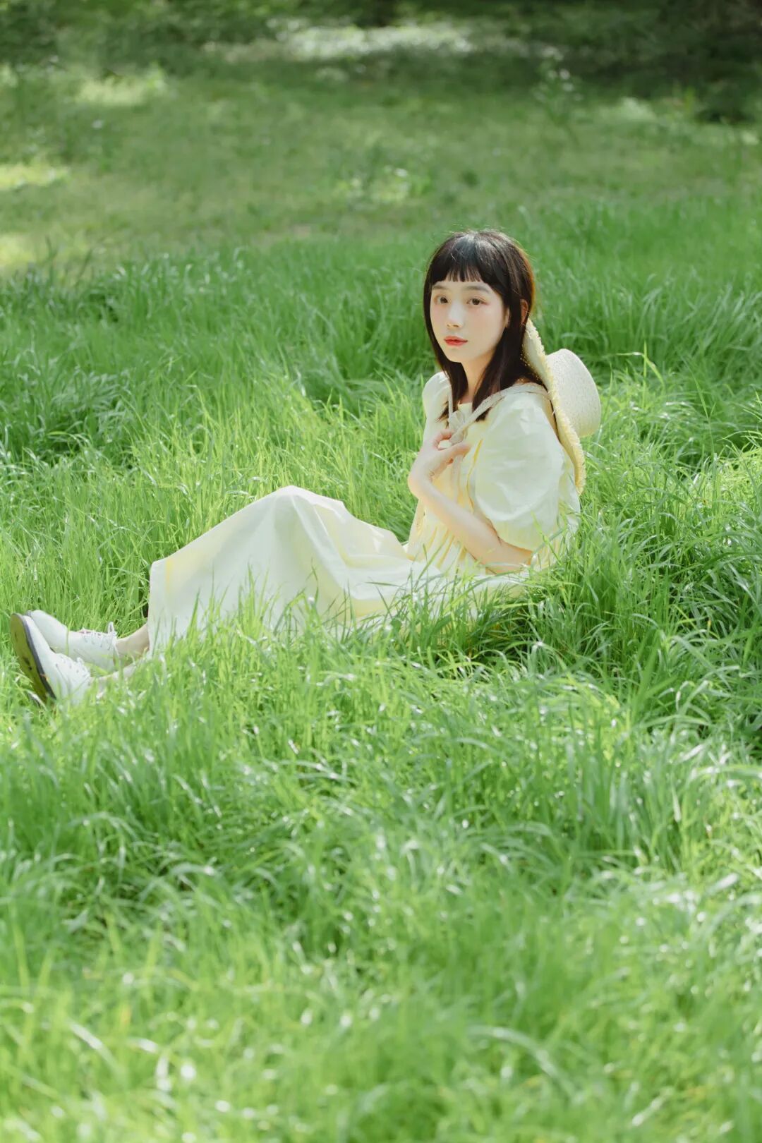 对于一组作品来说,前期是非常重要的,在我确定了主题之后,我首先想要一片大的草坪和树林,所以我把拍摄的地点选在了植物园,服装上想突出少女感和纯色系清淡的感觉,但也要和大面积的绿色相配,因此最终选择了淡黄色,妆容以自然的氧气感为主,去掉了眼线和浓重的眼妆,加重了腮红,更显模特的灵气,构图上以突显氛围情绪的大场景和中景为主,也会适当加入一些特写,后期主要的思路是把色调向黄绿色靠近,营造出淡淡的青柠感。