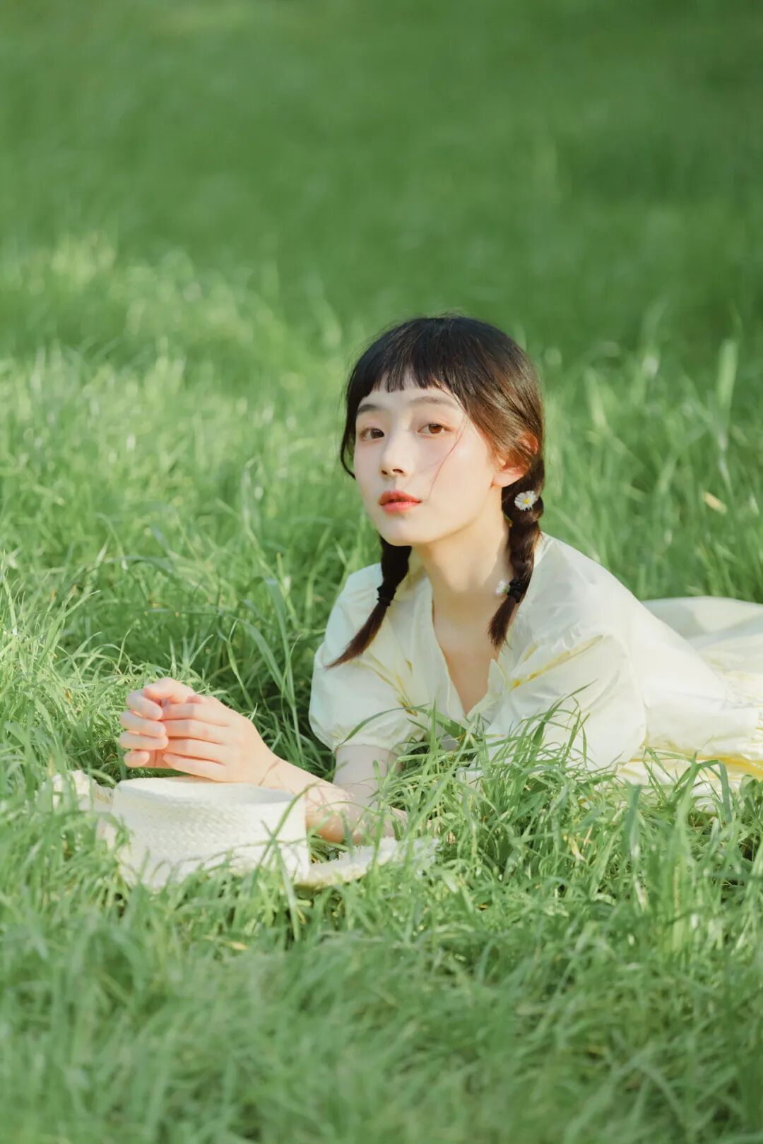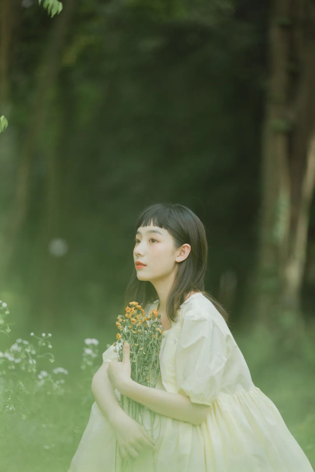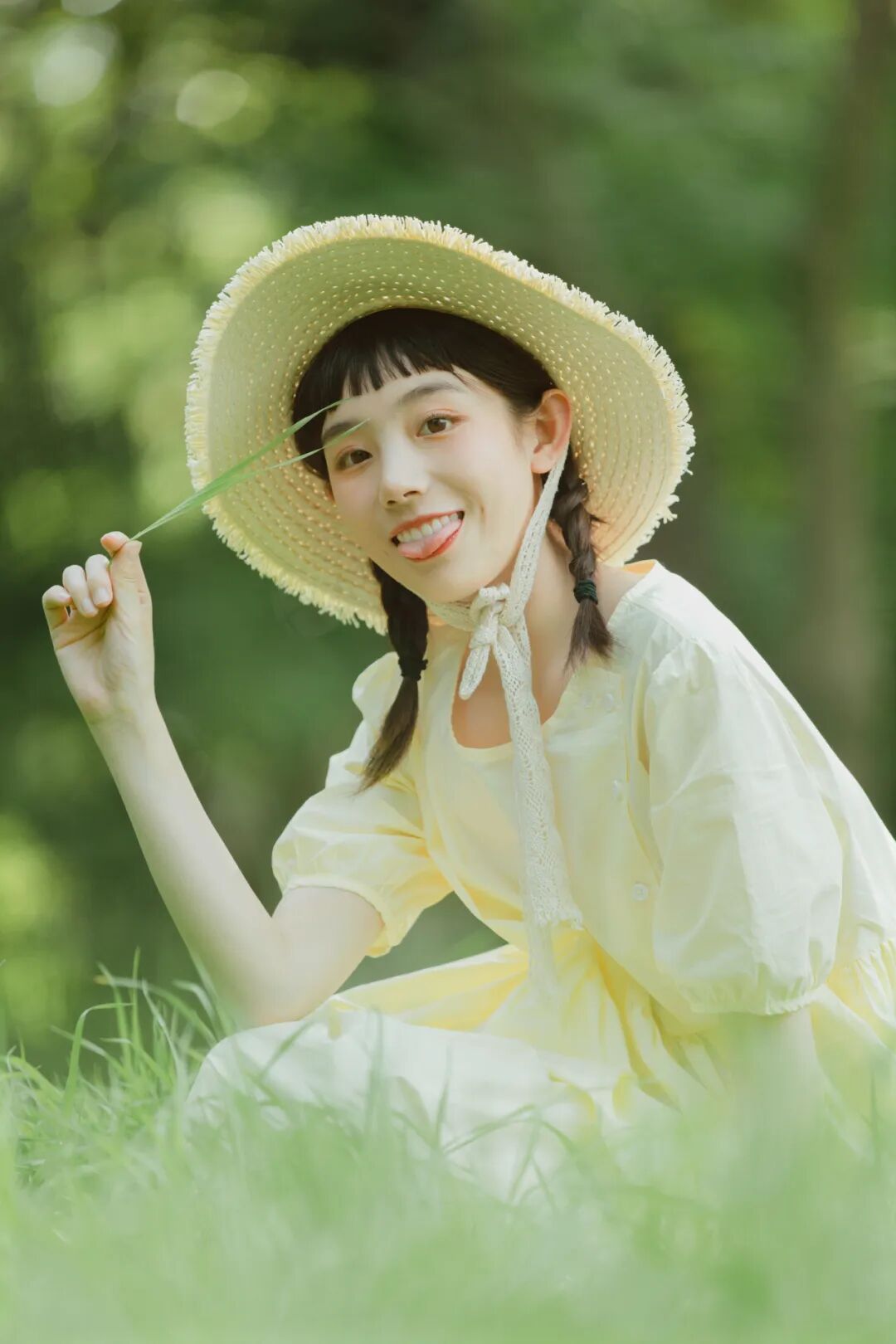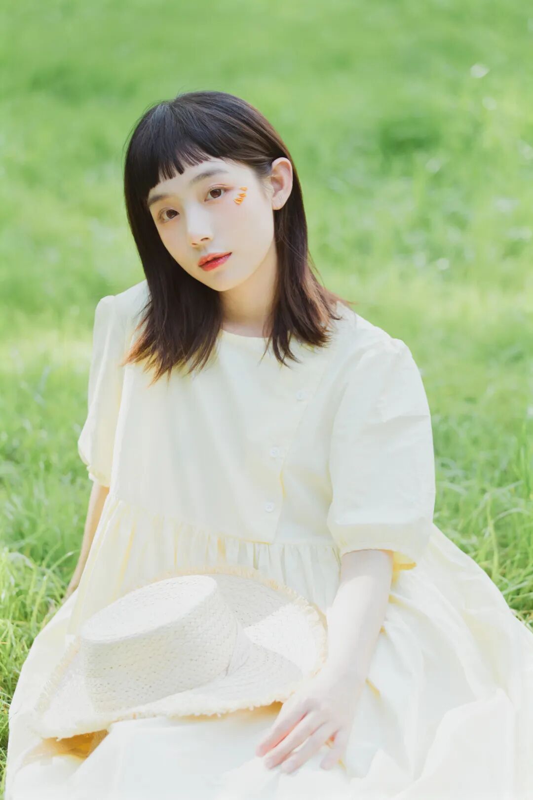 对于一组作品来说,前期是非常重要的,在我确定了主题之后,我首先想要一片大的草坪和树林,所以我把拍摄的地点选在了植物园,服装上想突出少女感和纯色系清淡的感觉,但也要和大面积的绿色相配,因此最终选择了淡黄色,妆容以自然的氧气感为主,去掉了眼线和浓重的眼妆,加重了腮红,更显模特的灵气,构图上以突显氛围情绪的大场景和中景为主,也会适当加入一些特写,后期主要的思路是把色调向黄绿色靠近,营造出淡淡的青柠感。