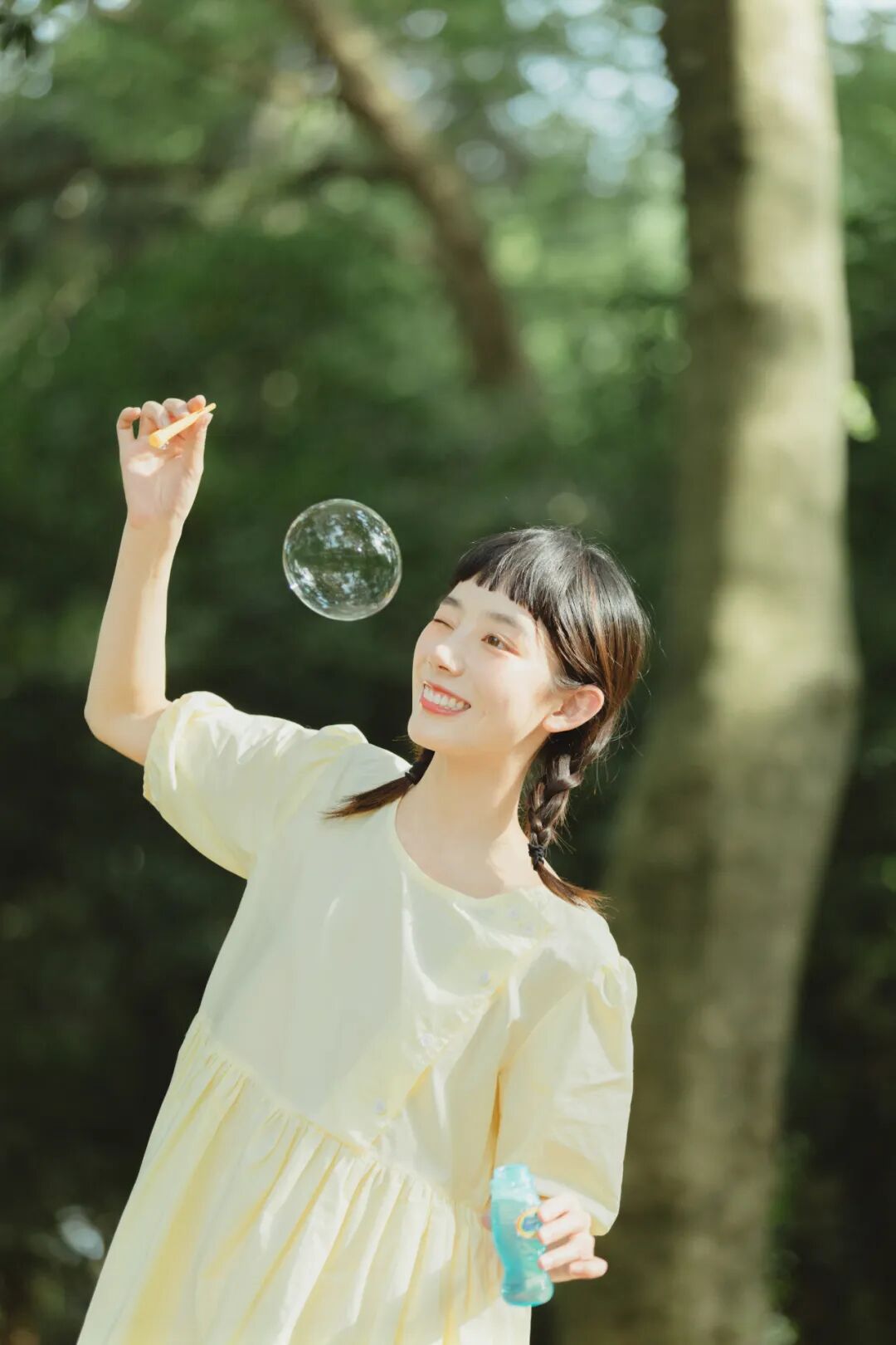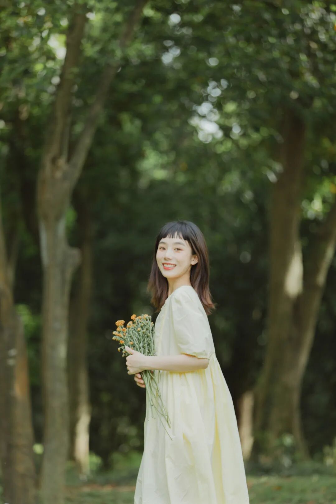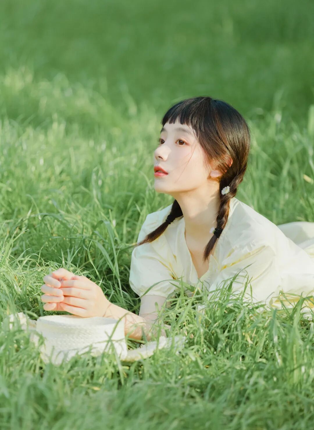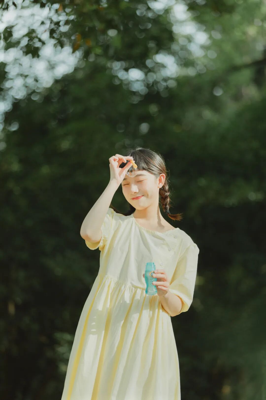 对于一组作品来说,前期是非常重要的,在我确定了主题之后,我首先想要一片大的草坪和树林,所以我把拍摄的地点选在了植物园,服装上想突出少女感和纯色系清淡的感觉,但也要和大面积的绿色相配,因此最终选择了淡黄色,妆容以自然的氧气感为主,去掉了眼线和浓重的眼妆,加重了腮红,更显模特的灵气,构图上以突显氛围情绪的大场景和中景为主,也会适当加入一些特写,后期主要的思路是把色调向黄绿色靠近,营造出淡淡的青柠感。