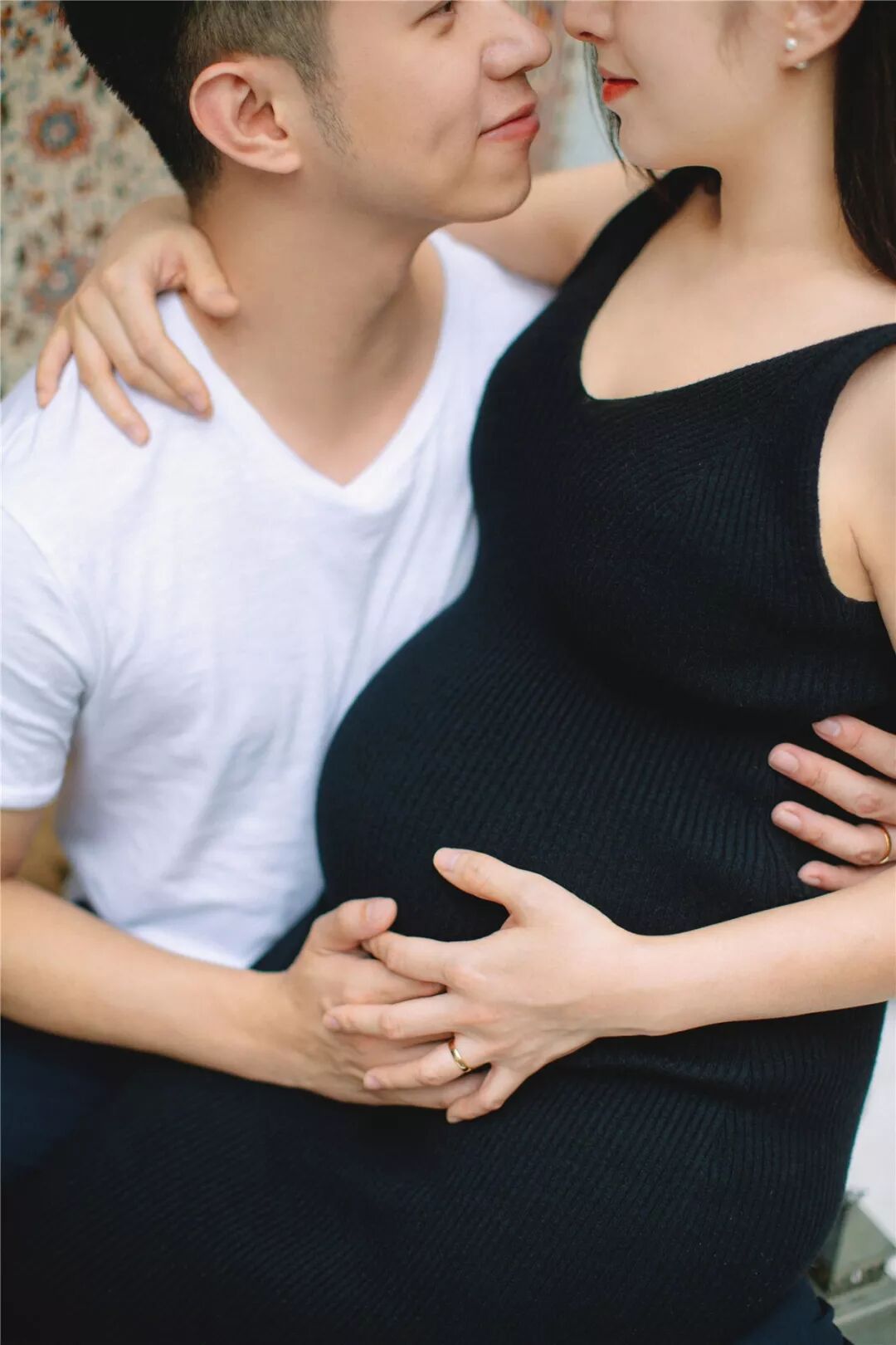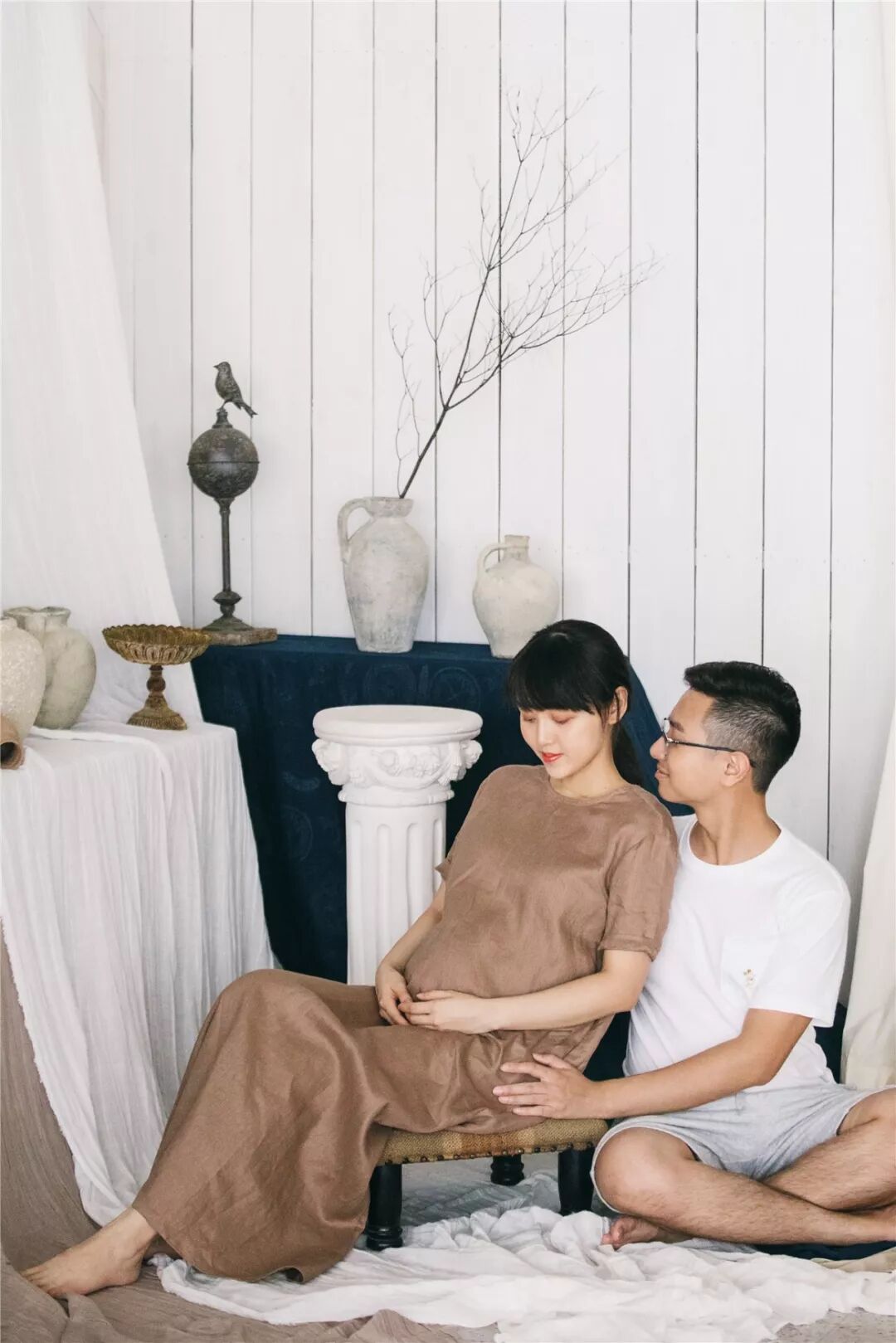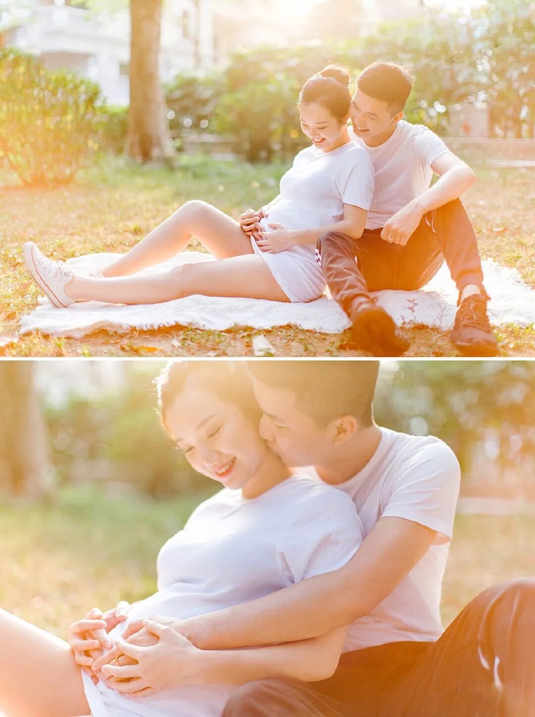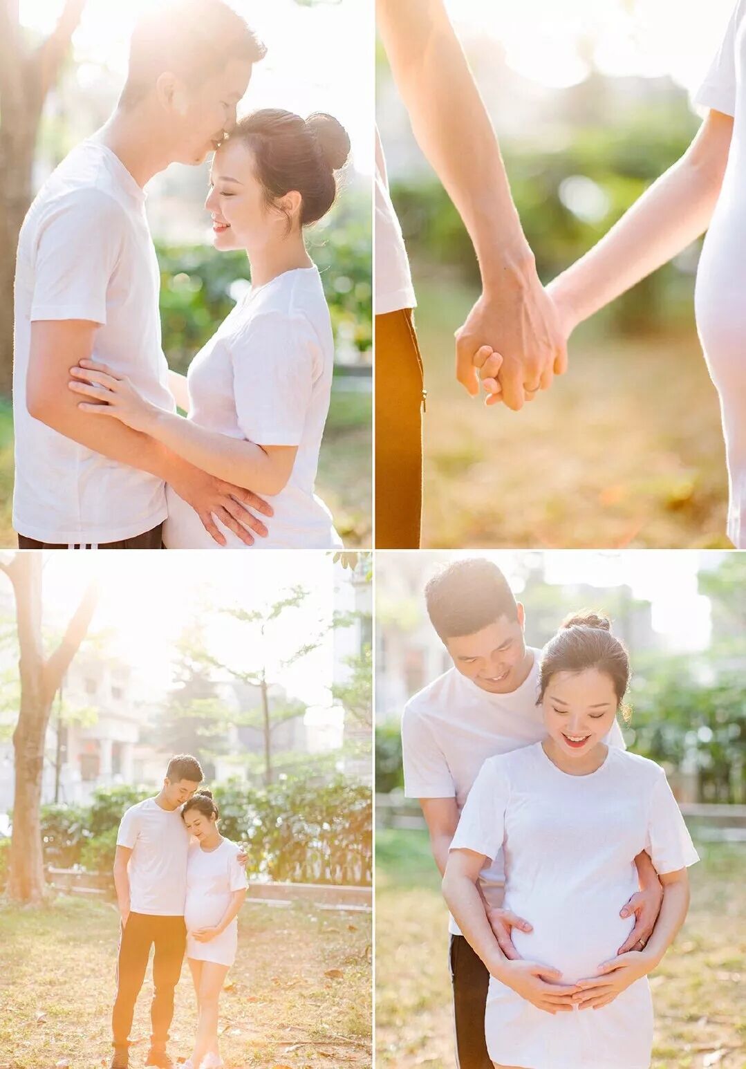 孕照自然也少不了准爸爸的出境,所以男士服装一般建议选择简单百搭的款式,例如衬衣或T恤,尽量跟孕妈的服装颜色相呼应,不要有过于花哨的图案。